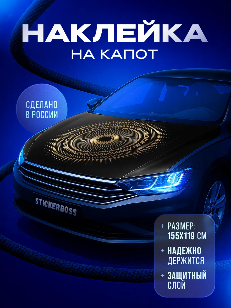 Большая декоративная наклейка на капот автомобиля из самоклеящейся виниловой пленки. Размер 155х119 см позволяет украсить капот большинства популярных авто, включая седаны, хэтчбеки и универсалы. Материал обеспечивает прочность изображения и устойчивость к мойкам, а верхний ламинированный слой защищает от выгорания на солнце. Наклейка легко снимается без следов, при желании можно подрезать под нужный размер. В коллекции представлены разнообразные дизайны: принты с надписями, персонажами фильмов, дикие животные, стиль аниме, флаги России, горы, города и многое другое. Товар упакован в защитную тубу, что обеспечивает сохранность во время доставки. Доставка по РФ.