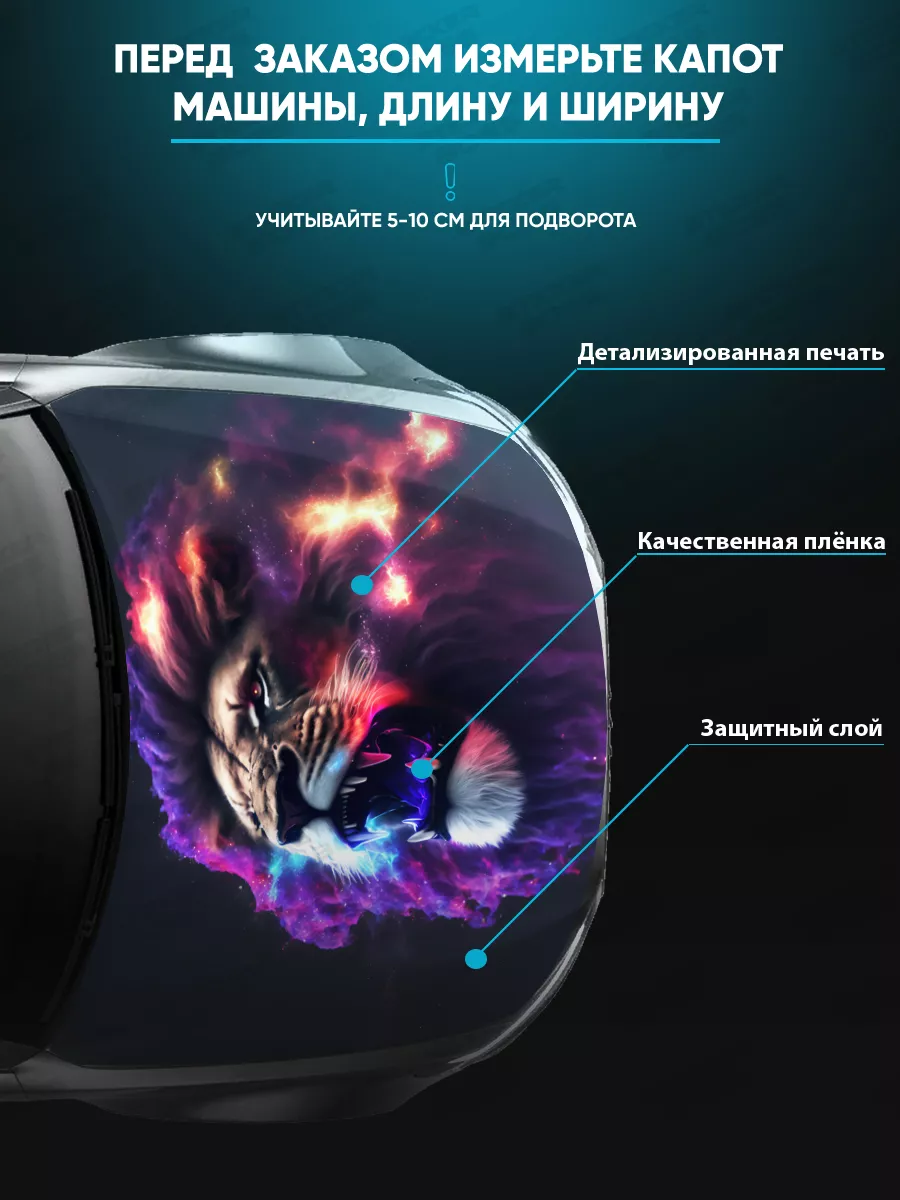 Эта наклейка на капот предоставляет автомобилю выразительный стиль и индивидуальность. Изготовлена на самоклеящейся виниловой пленке ПВХ с верхним слоем ламинации, что обеспечивает долговечность рисунка и защиту от выгорания на солнце. Размер 155x119 см универсальный и подходит для большинства седанов, хэтчбеков и универсалов. При необходимости можно подрезать лист под нужный размер. Упакована в защитную тубу для сохранности во время доставки. В коллекции множество вариантов дизайна: надписи, герои известных фильмов, изображения львов, тигров, волков, медведей, леопардов, собак, лошадей, а также аниме, флаги России, флаги футбольных клубов, горы, города и пейзажи.