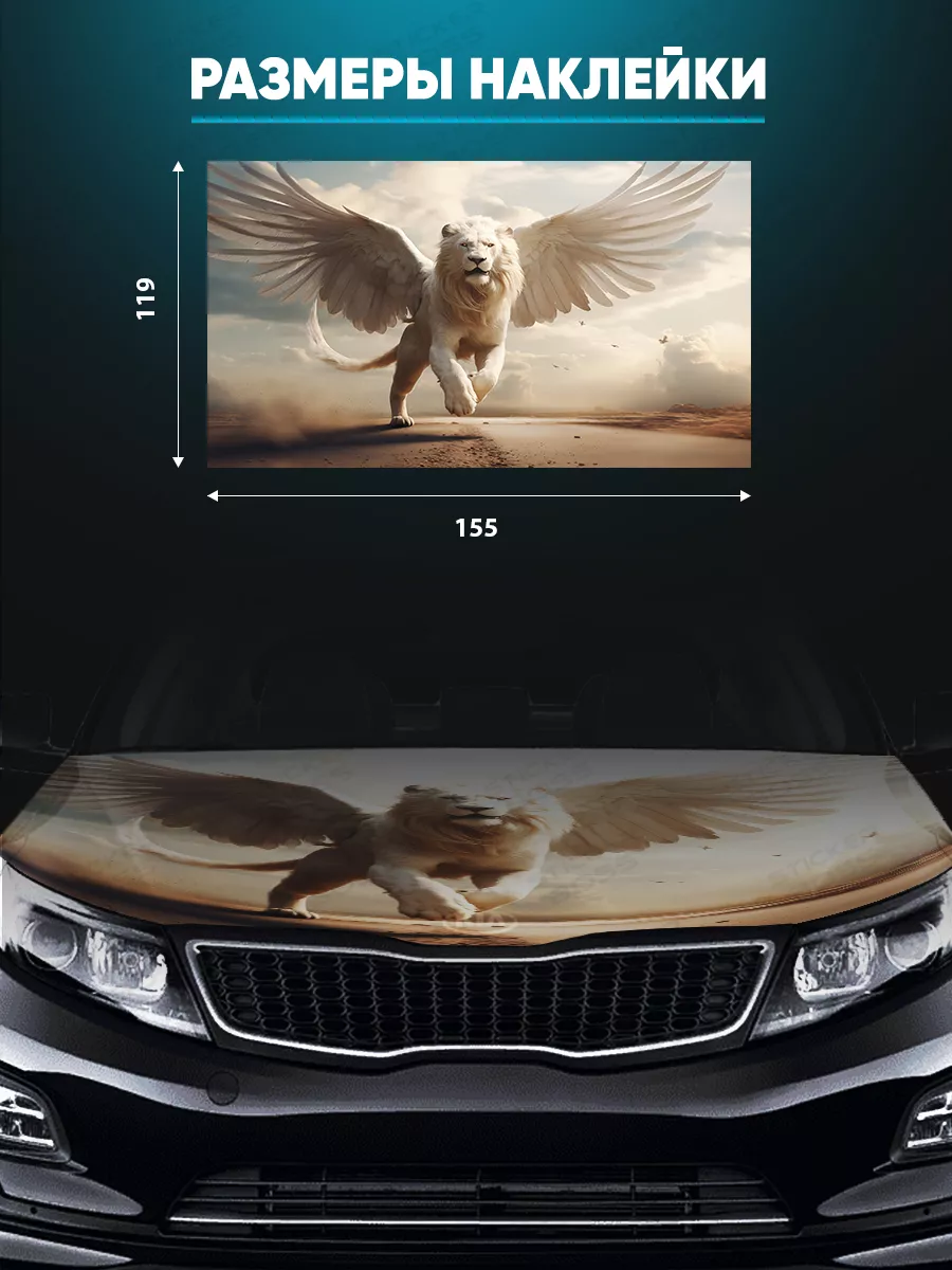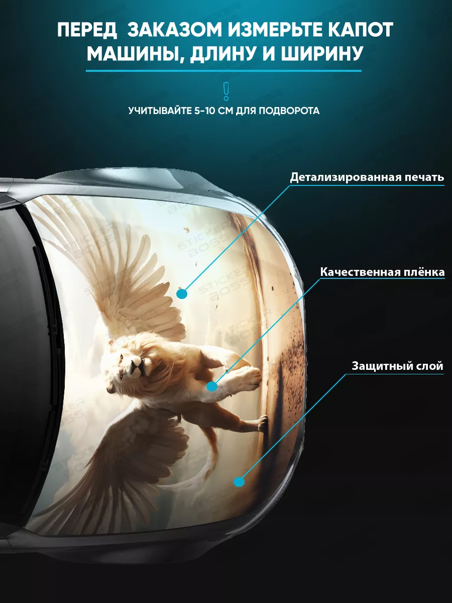 Эта наклейка на капот представляет декоративный элемент, позволяющий изменить стиль автомобиля и подчеркнуть индивидуальность. Размер 155х119 cm подходит для подавляющего большинства седанов, хэтчбеков и универсалов, при необходимости лист можно подрезать под размер. В ассортименте доступны дизайны с животными, героями, флагами России, пейзажами и многим другим.