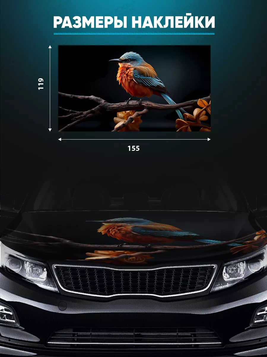 Эта наклейка на капот авто размером 155х119 см сочетает декоративность и практичность, позволяя придать автомобилю индивидуальный стиль. Заказчик получает крупный рисунок, который легко устанавливается на ровную поверхность и, при желании, подрезается под нужный контур.