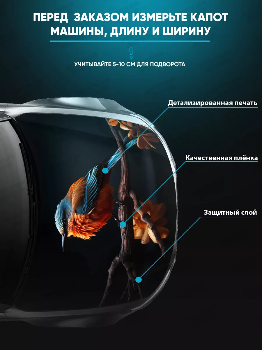 - Установка: наклейка наносится на капот; можно подрезать