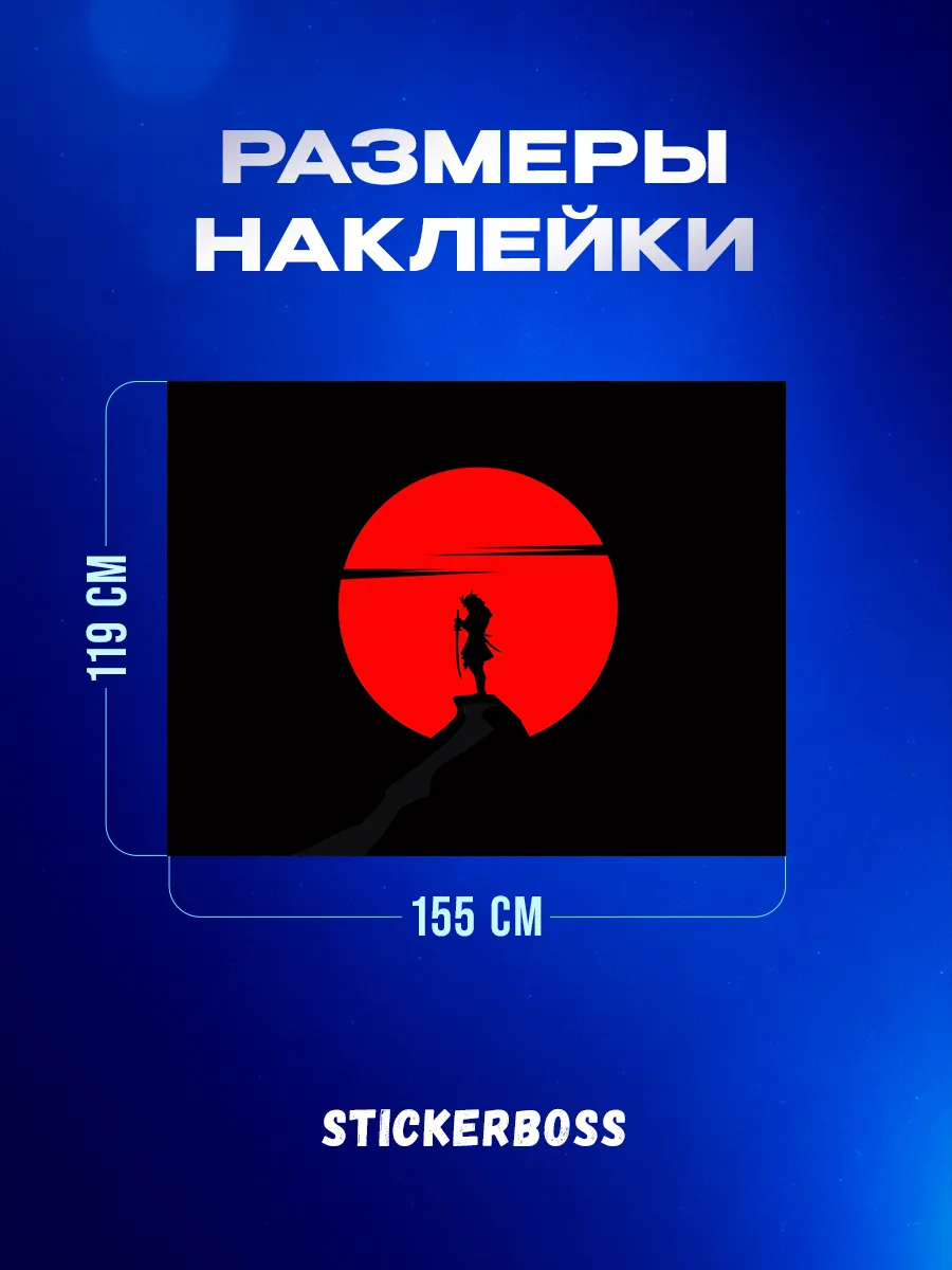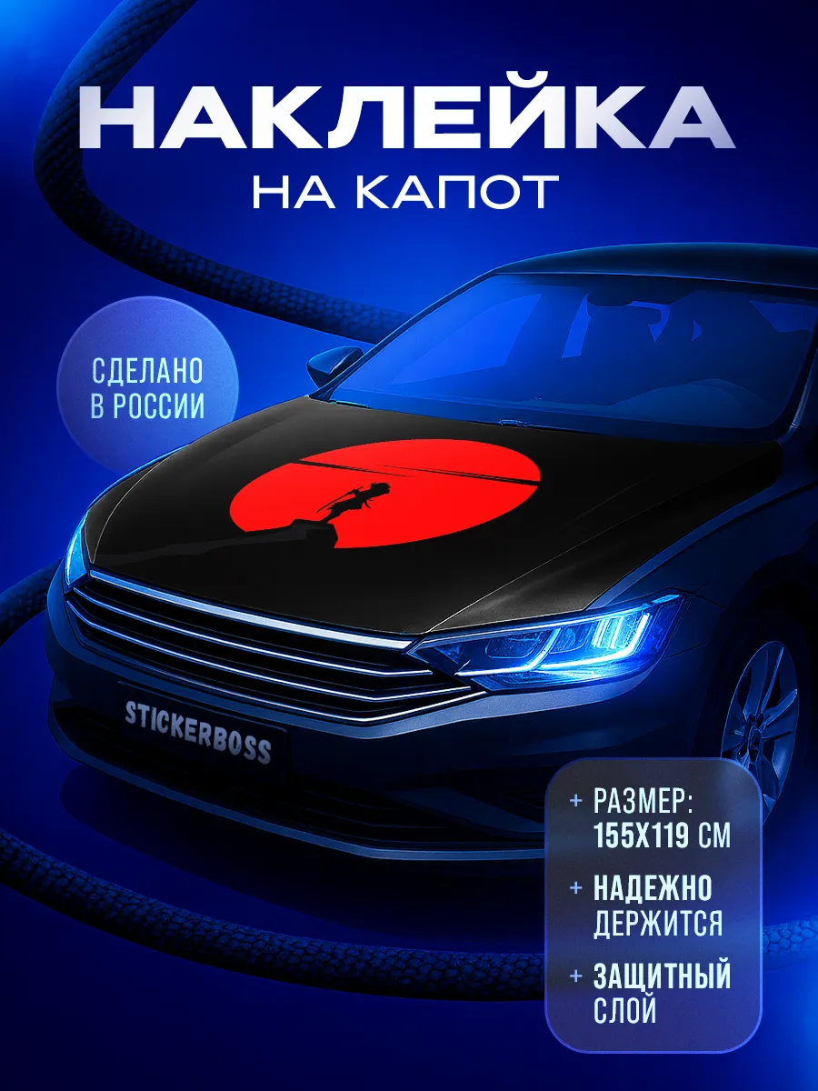 \nСтикер имеет универсальный размер 155х119 см, подходит для капотов большинства популярных автомобилей. В образе — воины-самураи в японском стиле; цвета черный и красный подчеркивают контраст и динамику. Материал — виниловая пленка ПВХ; покрытие ламинацией обеспечивает долговечность. Товар марки Stickerboss; артикул Капотная784; страна производства — Россия.