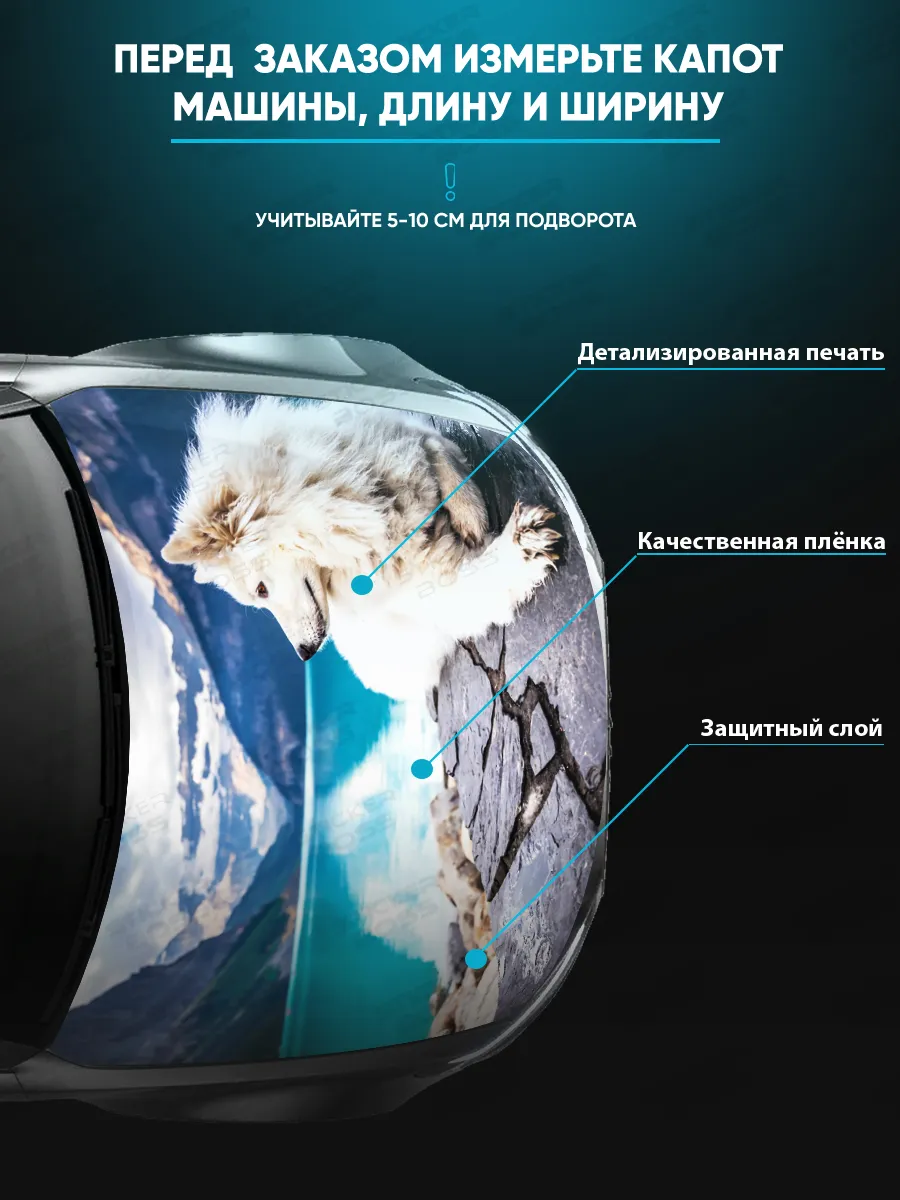 Большая декоративная наклейка на капот автомобиля придаст вашему авто выразительный стиль. Универсальный размер 155х119 см подходит для большинства капотов седанов, хэтчбеков и универсалов, и при необходимости легко подрезается под нужный контур.