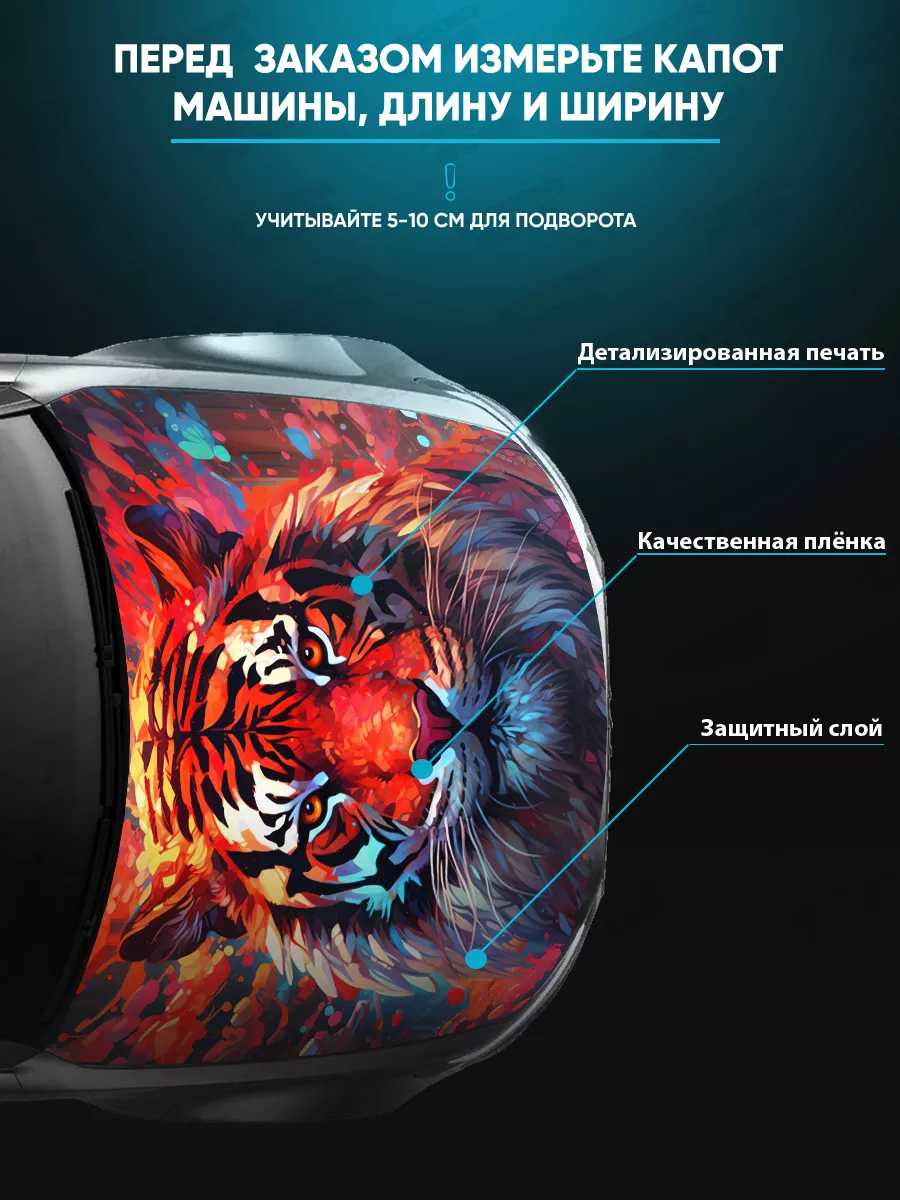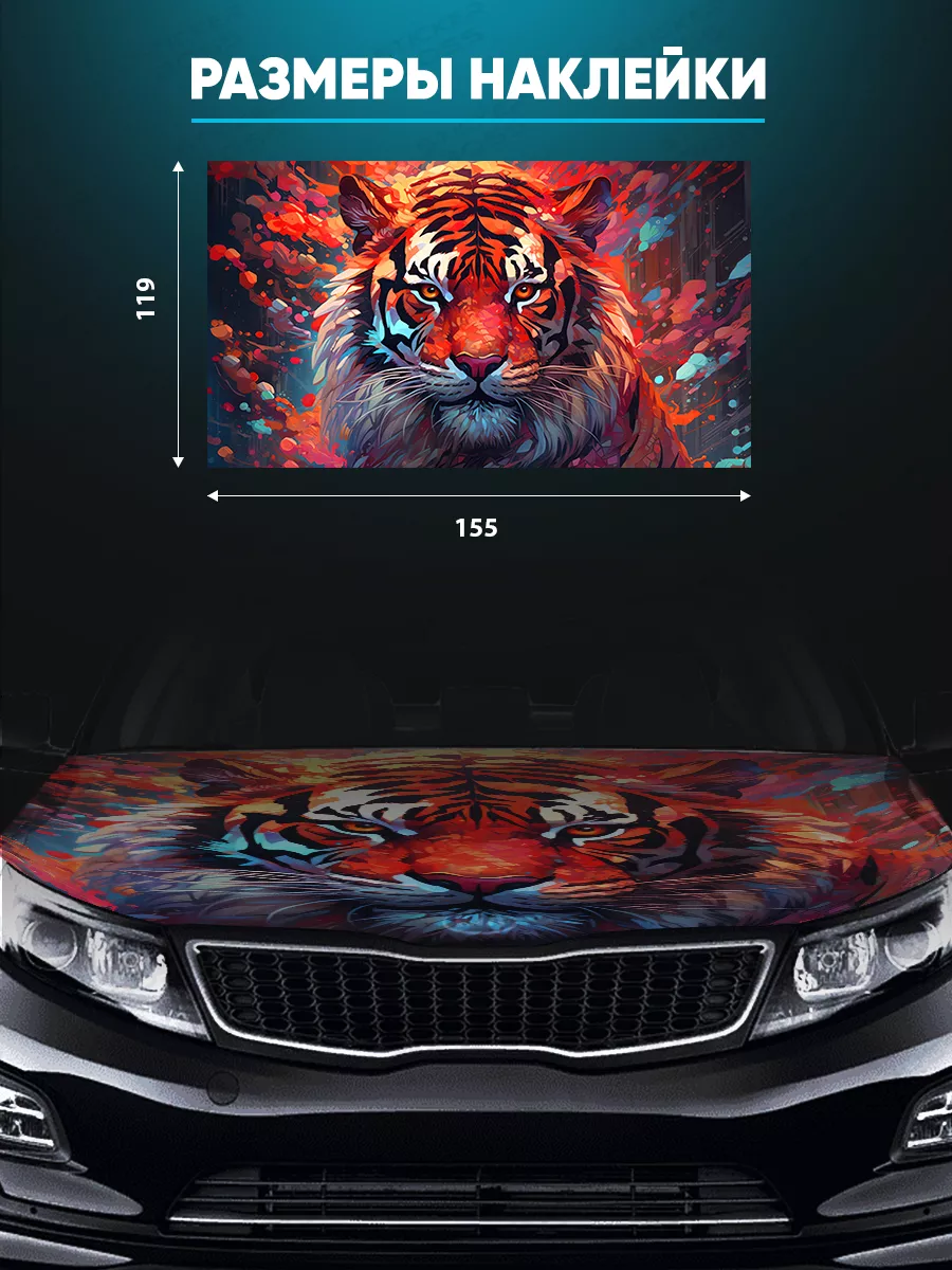 Большая наклейка на капот автомобиля размером 155×119 см позволяет придать машине уникальный стиль. Она подходит для большинства седанов, хэтчбеков и универсалов. Изготовлена на качественной самоклеящейся виниловой пленке ПВХ Oracal с верхним ламинированным слоем, который защищает цвет и поверхность от влаги и солнечных лучей. При желании можно подрезать лист по contour капота, а затем снять наклейку без следов.