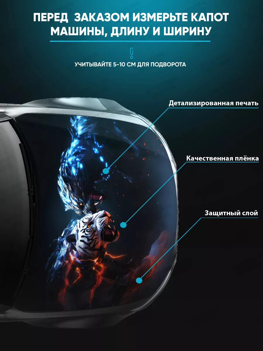 Позволяет украсить капот и придать автомобилю индивидуальность. В коллекции доступны мотивы с надписями, животными и городскими пейзажами для любого вкуса.