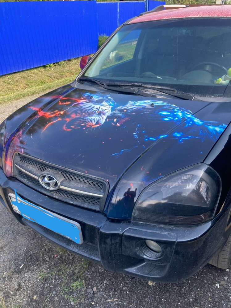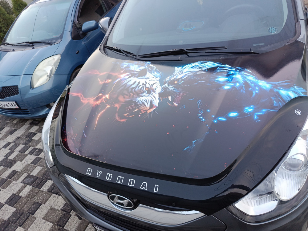 Очистите поверхность капота, снимите защитную пленку и равномерно разместите наклейку, избегая пузырьков воздуха. При необходимости можно подрезать лишний край по контуру капота.