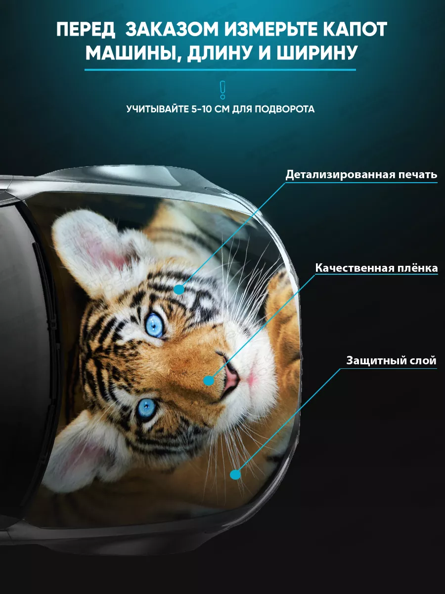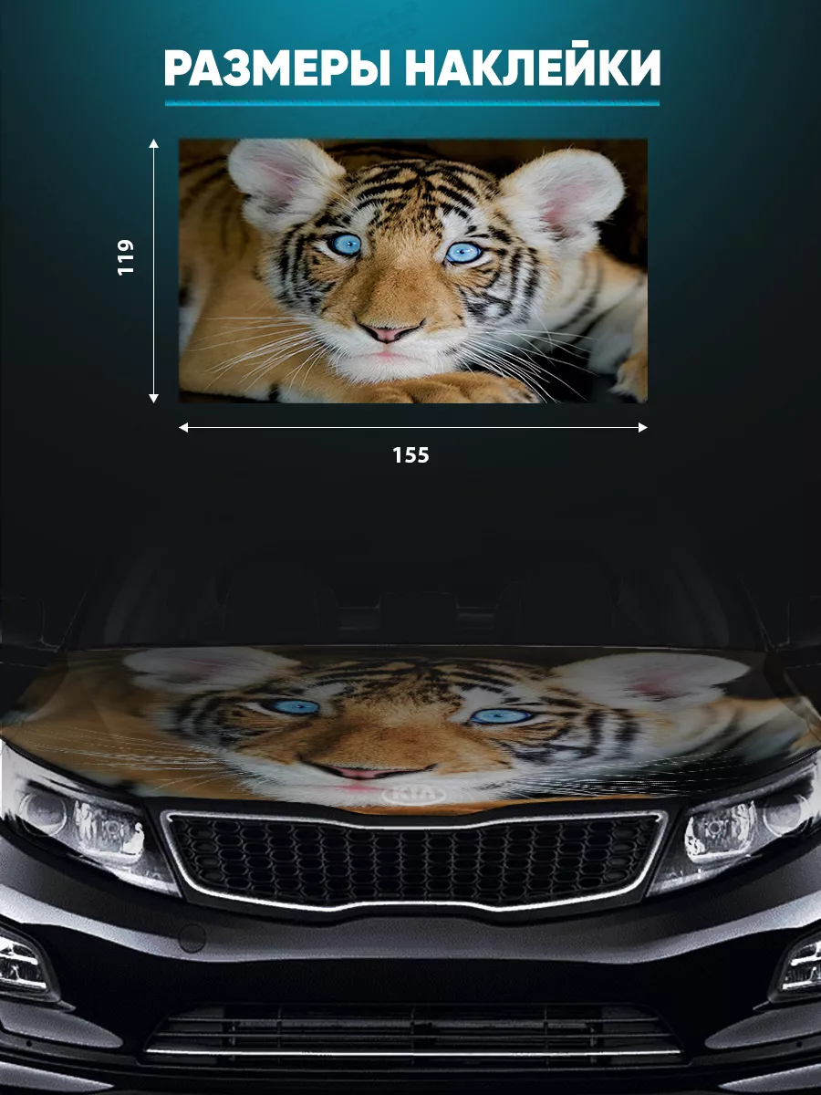 Эта наклейка предназначена для капота автомобиля и предлагает большой размер 155х119 см. Она изготовлена из самоклеящейся виниловой пленки ПВХ с дополнительным верхним слоем ламинации, что повышает стойкость к солнечному свету и погоде.