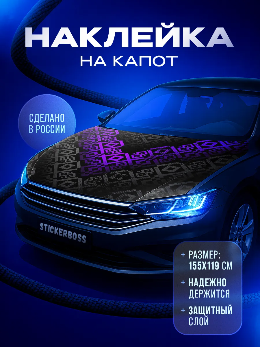 Эта наклейка призвана украсить капот автомобиля и подчеркнуть его стиль. Изготовлена на качественной самоклеящейся виниловой пленке ПВХ, размер 155х119 см и универсальна по применению — подходит для седана, хэтчбека и универсала. По желанию можно подрезать лист под нужный размер. Ламинация обеспечивает защиту от пыли, влаги и солнечного выгорания, а самоклейка держится надёжно на поверхности.