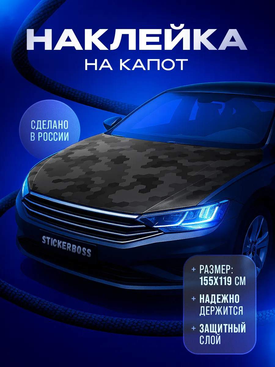 Декоративная наклейка на капот авто размером 155x119 см позволяет быстро изменить стиль машины. Изготавливается на основе самоклеящейся виниловой пленки ПВХ и поставляется в защитной тубе для сохранности во время доставки.