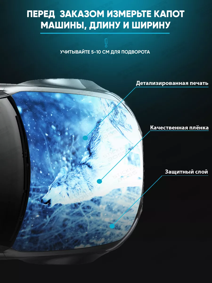 Большая декоративная наклейка на капот автомобиля размером 155х119 см позволяет придать машине яркий индивидуальный вид. Наклейка изготовлена на самоклеящейся виниловой пленке ПВХ и обеспечивает надежное приклеивание к поверхности. За счет верхнего слоя ламинации она устойчива к пыли, влаге и любым мытьям, не выгорает на солнце. При необходимости можно подрезать лист под нужный размер. В коллекции Stickerboss есть множество вариантов: принты с надписями, персонажи кино, а также динамичные изображения волков, львов, тигров и других животных. Наклейка добавляет автомобилю стиль и индивидуальность.