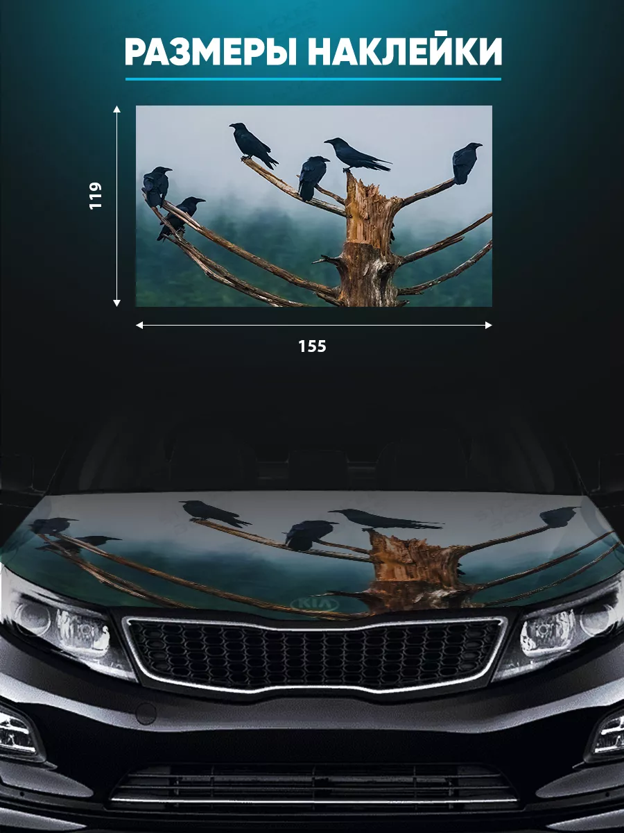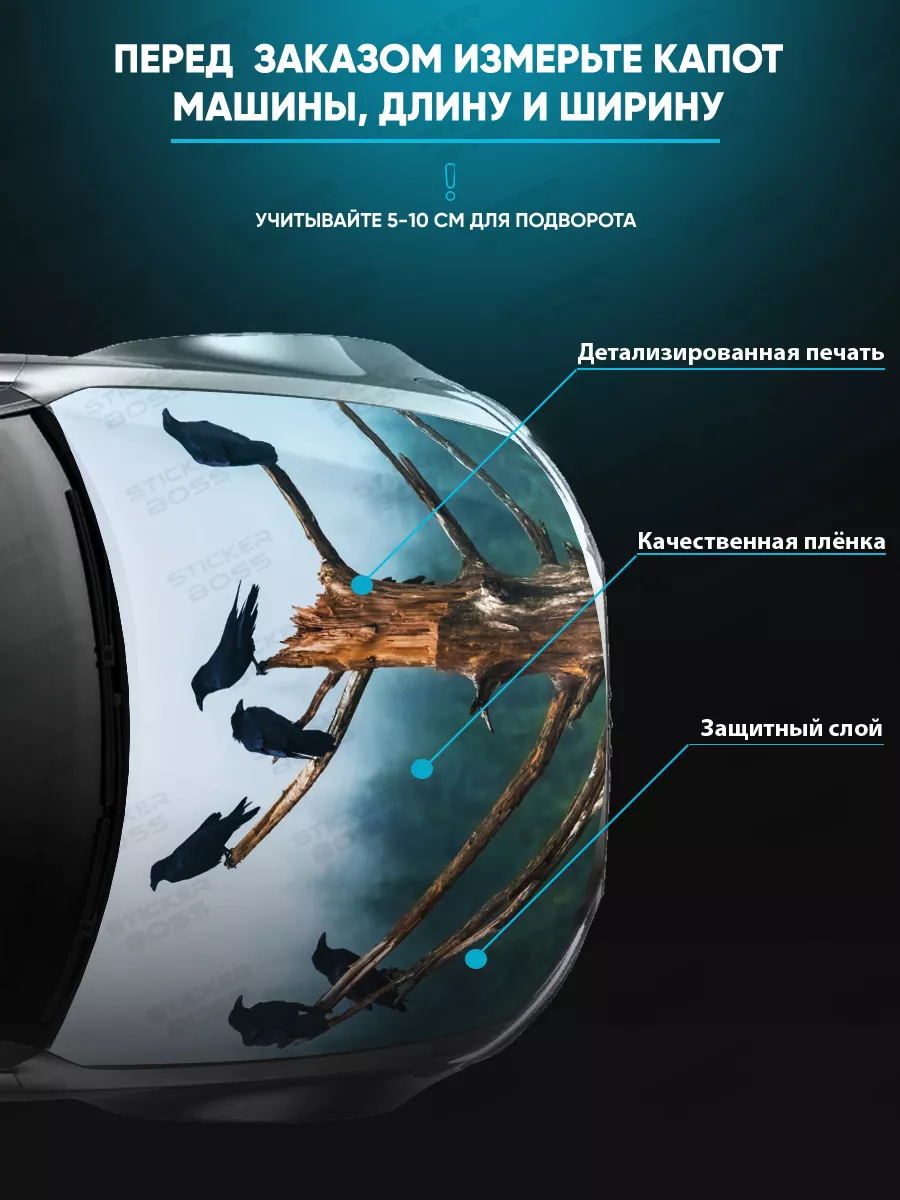 Декоративная наклейка предназначена для украшения капота автомобиля. В коллекции Stickerboss представлены варианты с надписями, животными, флагами, пейзажами и другими мотивами, которые позволяют подобрать дизайн под стиль машины.
