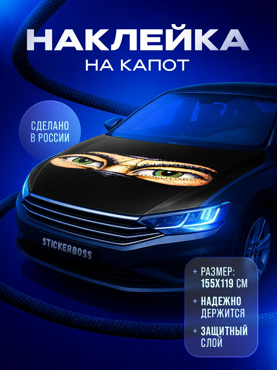 Эта наклейка предназначена для придания автомобилю выразительного стиля за счет крупного рисунка на капоте. Размер 155х119 см подходит большинству седанов, хэтчбеков и универсалов. Материал — самоклеящаяся виниловая пленка ПВХ с верхним ламинированным слоем, что повышает стойкость к мойкам, влаге и солнечному выцветанию. При желании можно подрезать лист под нужный размер, а при снятии не оставлять следов. В коллекции представлены принты с надписями, героями известных кинофильмов, изображениями животных, аниме-стилем, флагами России, пейзажами и многим другим.