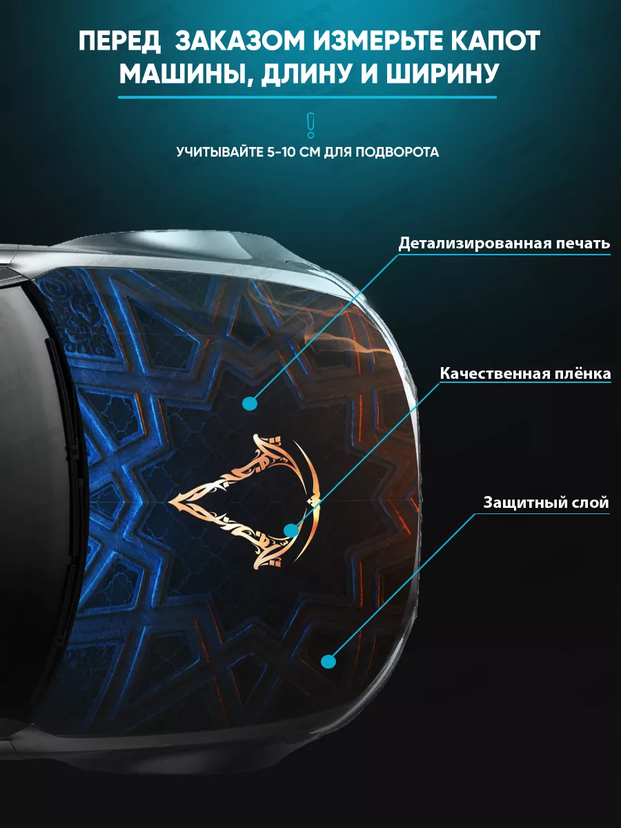 Эта наклейка на капот представляет собой крупный декоративный элемент, который позволяет быстро преобразить внешний вид автомобиля. Универсальный размер 155х119 см подходит для большинства моделей и при необходимости может быть подрезан под форму капота. Изготовлена на качественной самоклеящейся виниловой пленке ПВХ, что обеспечивает прочное сцепление к поверхности и защиту от мытья, влаги и солнечного воздействия за счет ламинированного слоя.