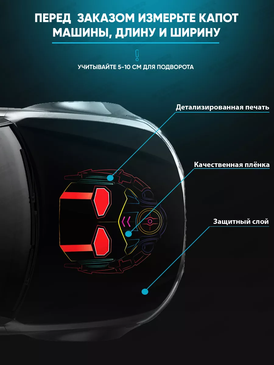 \nНаклейку можно применить на капот большинства популярных авто: седан, хэтчбек или универсал. При необходимости лист можно подрезать под нужный размер.