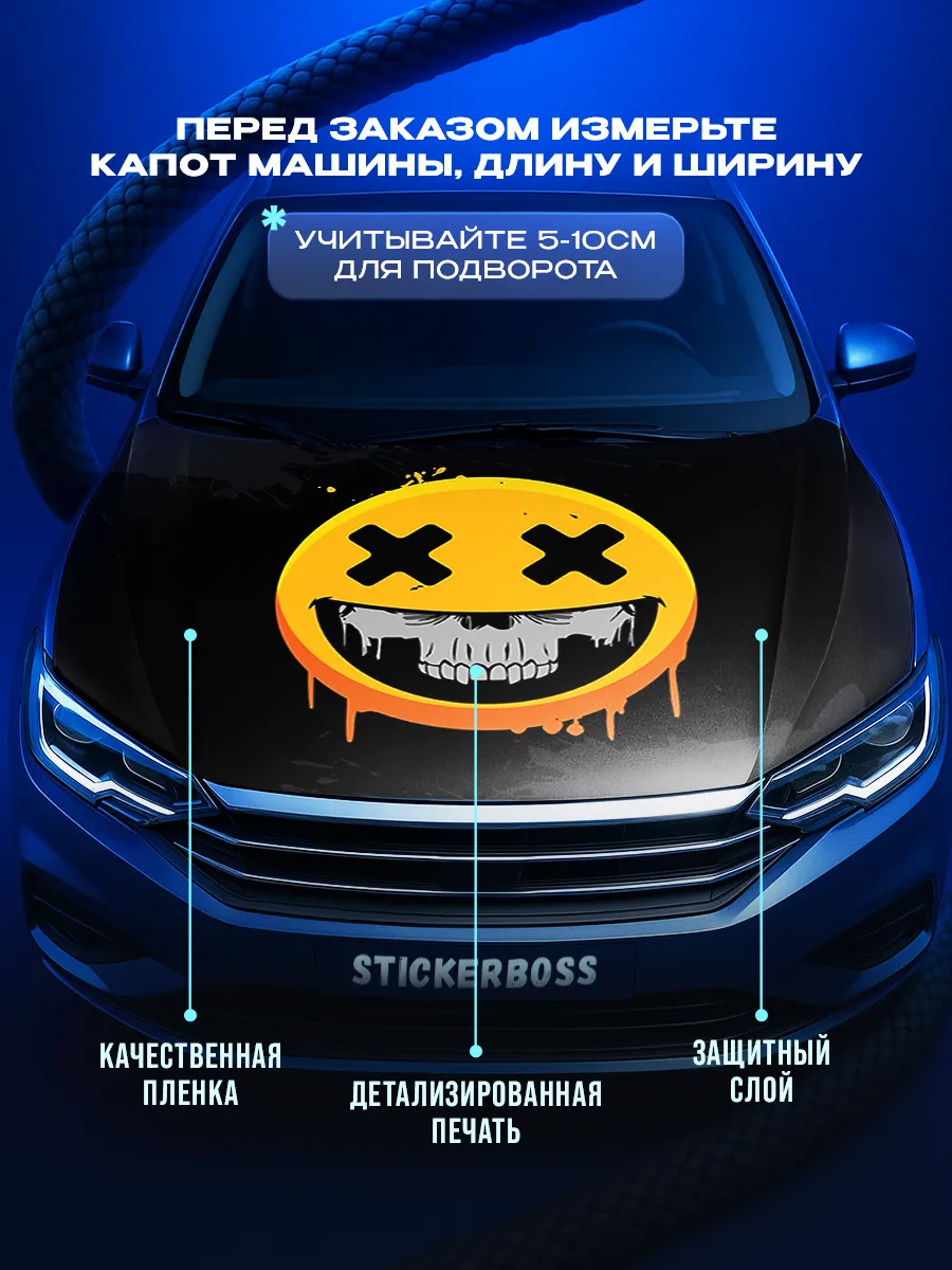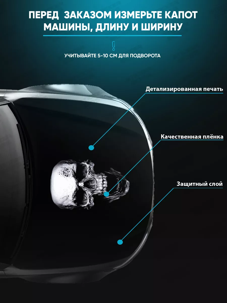 Наклейка на капот автомобиля визуально преображает внешний вид и подчеркивает стиль водителя. Эта наклейка размером 155х119 см подходит большинству капотов и изготовлена из самоклеящейся виниловой пленки ПВХ.