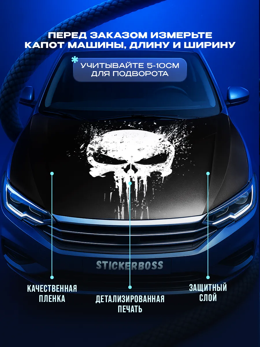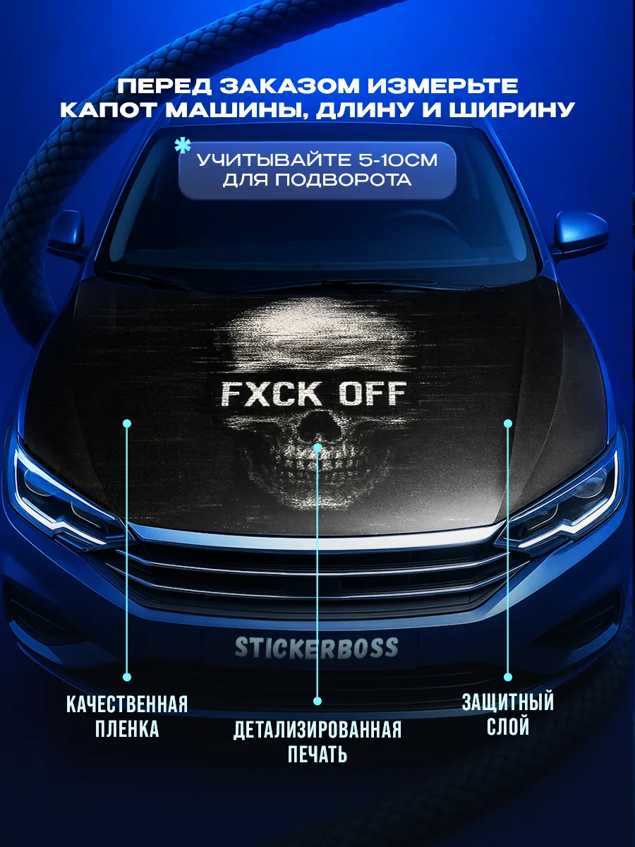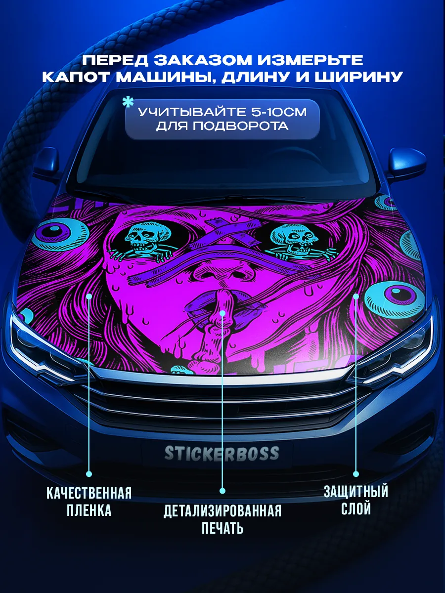 Эта наклейка на капот крупного размера предназначена для украшения авто и добавления индивидуального стиля. Размер 155х119 см обеспечивает охват зоны капота и может быть подрезан под нужный контур.