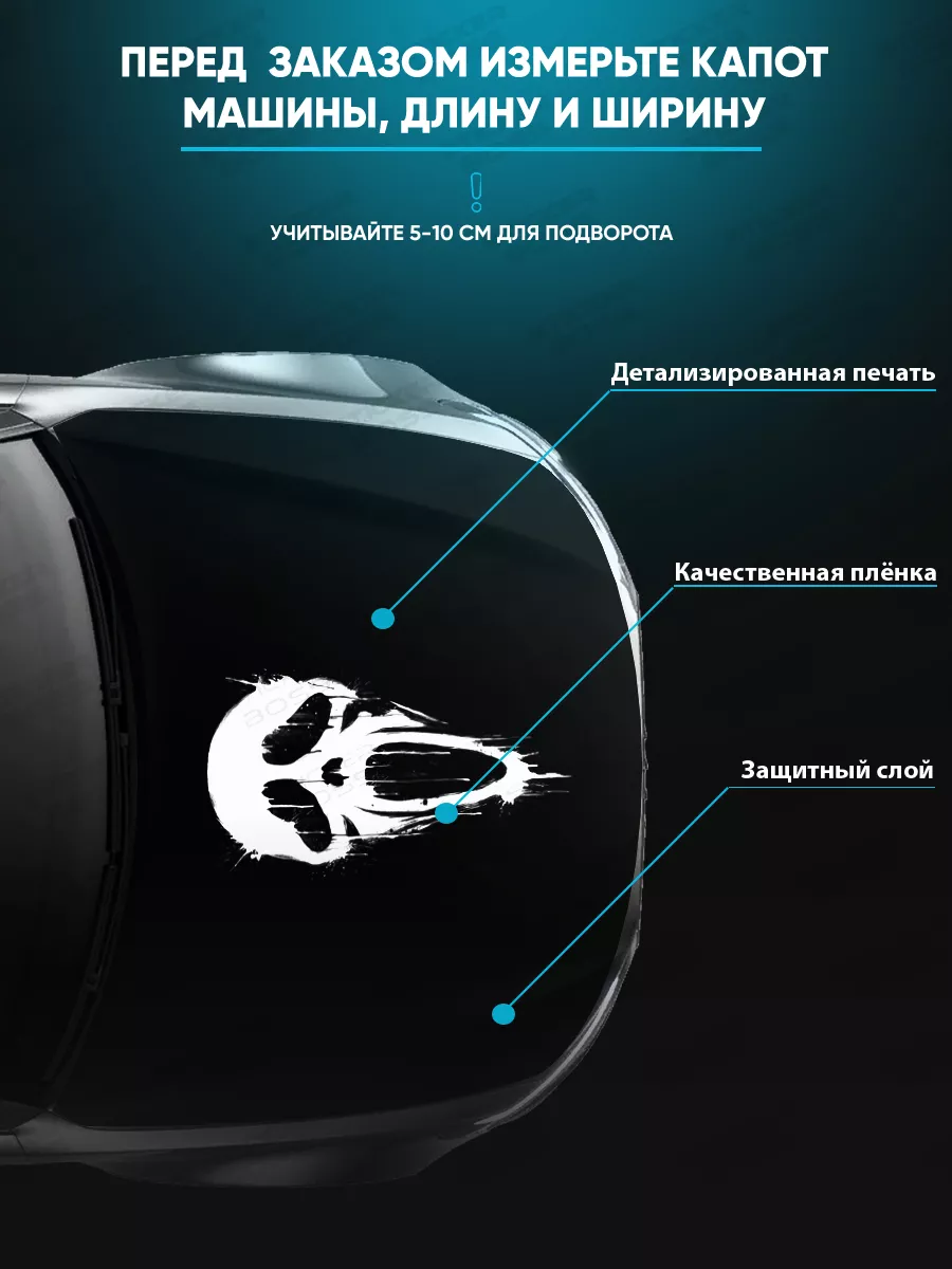 Подойдет на капоты большинства популярных автомобилей — седан, хэтчбек или универсал. При желании можно подрезать лист под нужный размер, чтобы аккуратно уложить изображение на поверхность.