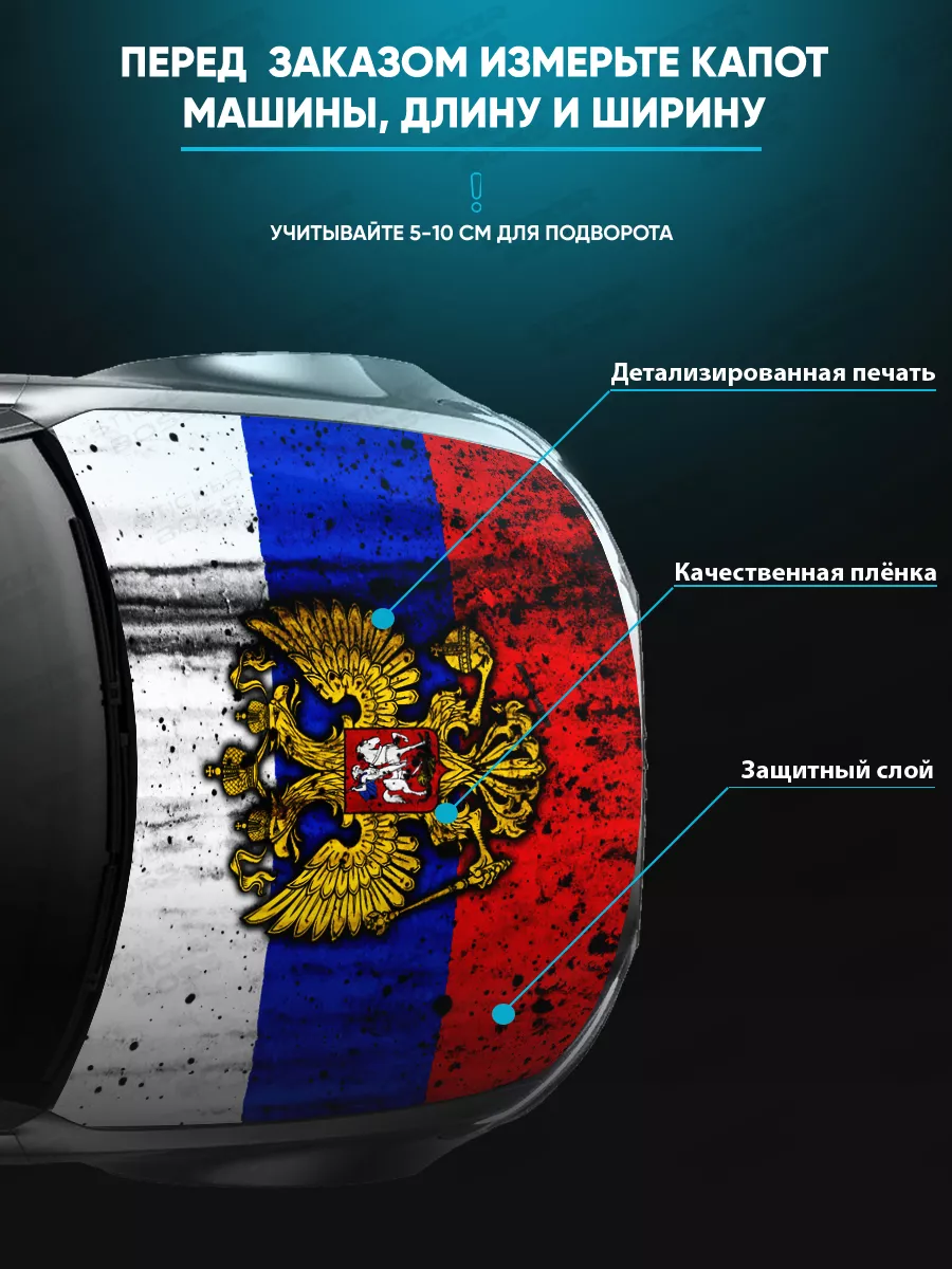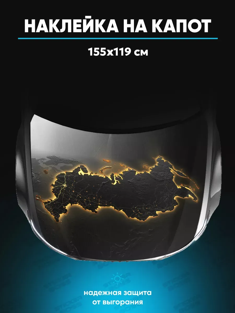 Большая наклейка на капот автомобиля, выполненная из самоклеящейся виниловой пленки ПВХ. Размер 155х119 см обеспечивает охват большой части капота. Пленка прочная и устойчива к мытью, пыли, влаге, а благодаря верхнему слою ламинации — к солнечному свету. По желанию можно подрезать лист под нужный размер, не повредив материал.