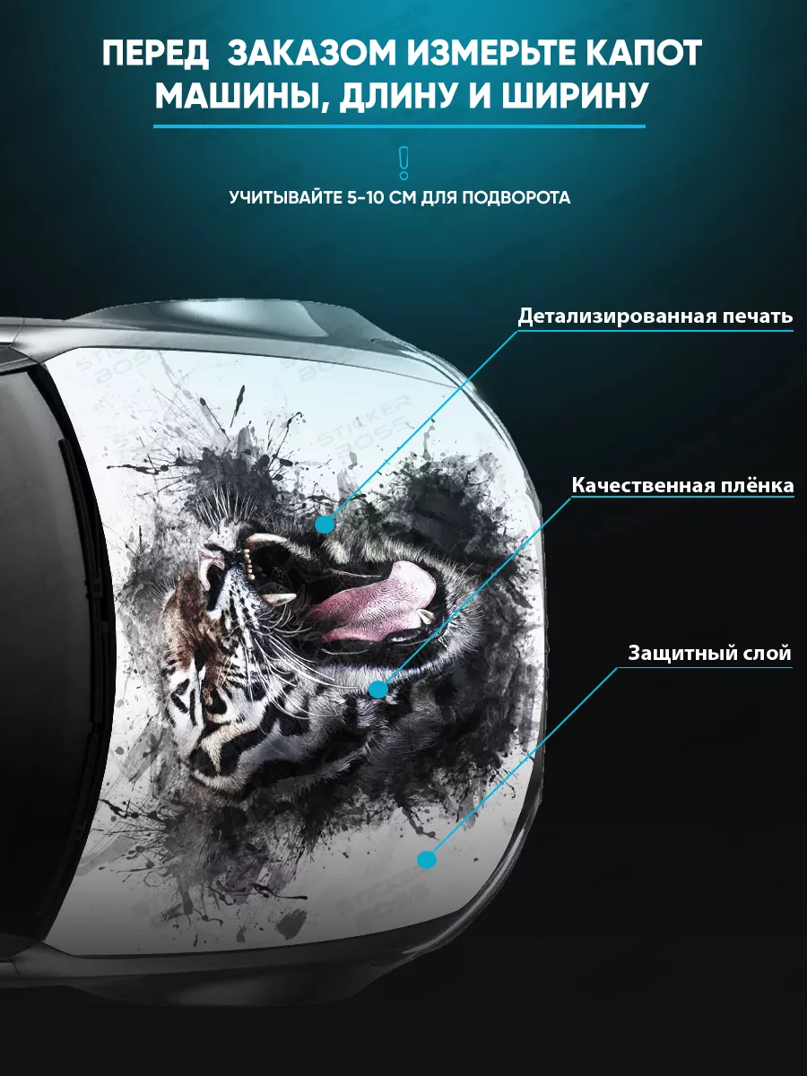 Капотная наклейка выполнена на самоклеящейся виниловой пленке ПВХ, влагостойкая, устойчивая к пыли и солнечному свету. Дополнительная ламинация защищает краску от выгорания и износа. При необходимости можно подрезать лист под нужный размер.