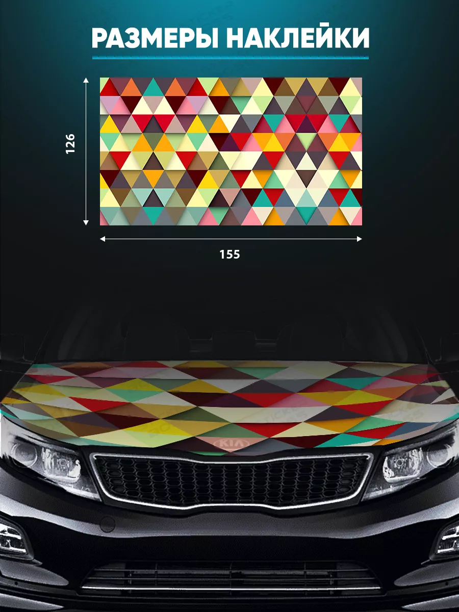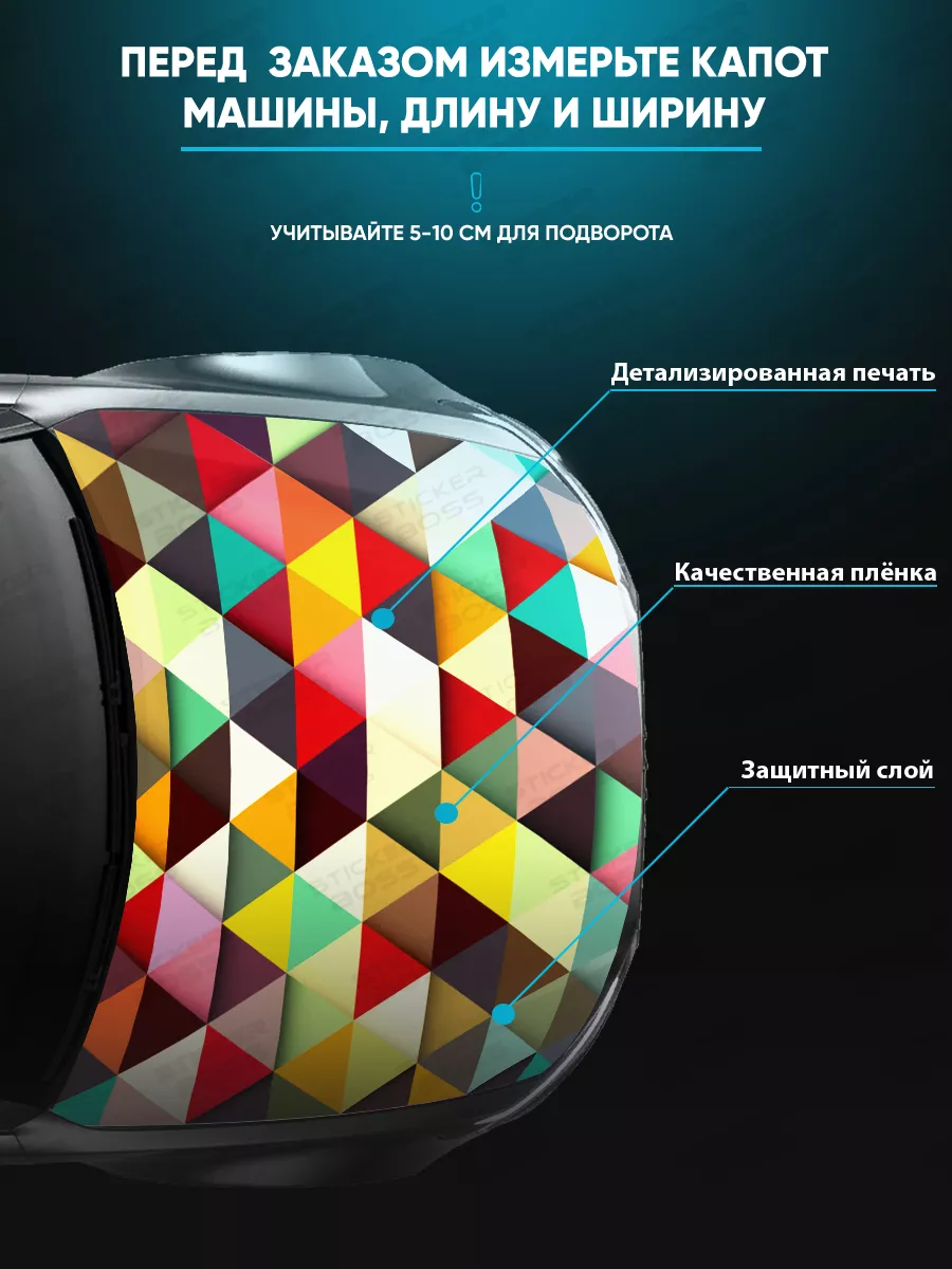 Эта наклейка на капот обеспечивает декоративность и индивидуальность вашего автомобиля. Размер 155х119 см делает ее совместимой с большинством седанов, хэтчбеков и универсалов. Изготовление из самоклеящейся виниловой пленки ПВХ с верхним слоем ламинации защищает цвет от выгорания, влаги и пыли. При желании легко снимается без следов. Товар упаковывается в защитную тубу для сохранности при доставке.
