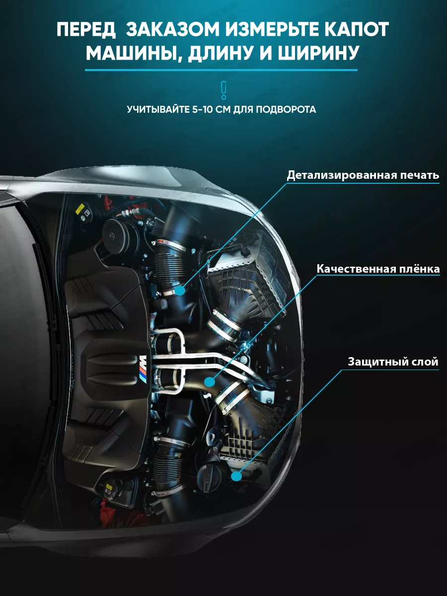 Лист можно подрезать под нужный размер, что позволяет адаптировать дизайн под конкретный капот. Гибкая конструкция обеспечивает надежное сцепление с различными поверхностями. При необходимости наклейку можно легко снять без повреждений поверхности.