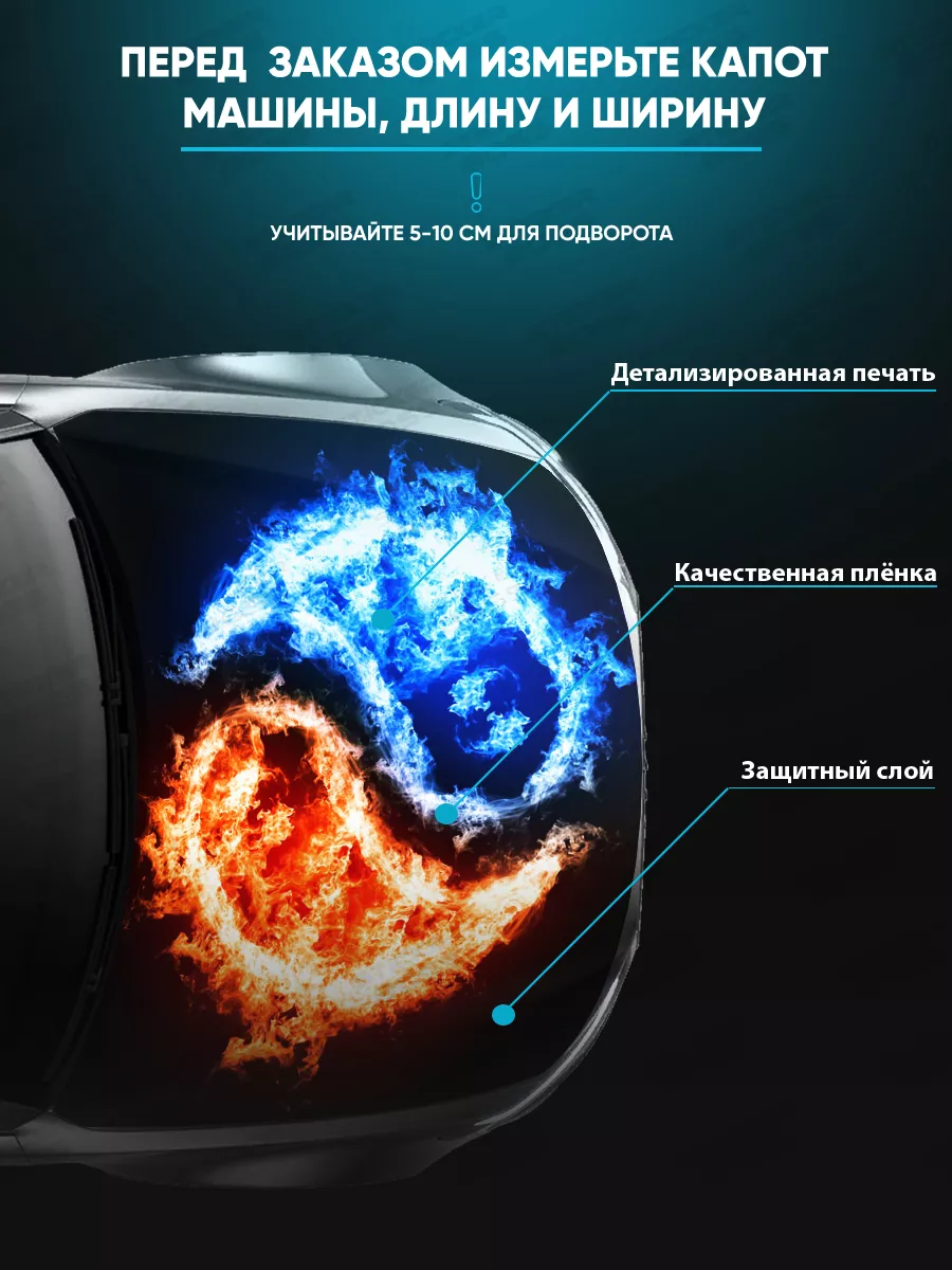 Предназначена для украшения капота автомобиля и добавления индивидуальности. Подходит для самых распространённых типов кузова: седан, хэтчбек и универсал. При необходимости можно подрезать лист под нужный размер.