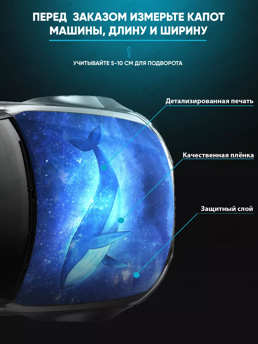 Наклейка предназначена для украшения капота, но подходит и для других декоративных целей по поверхности автомобиля. В коллекции есть принты с надписями, изображениями животных, аниме стилем и прочими мотивами, включая флаги и пейзажи. При необходимости можно подрезать лист под нужный размер.