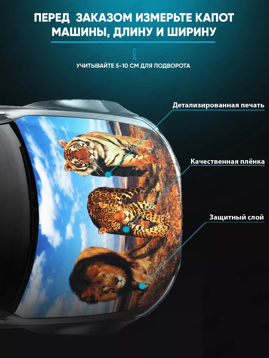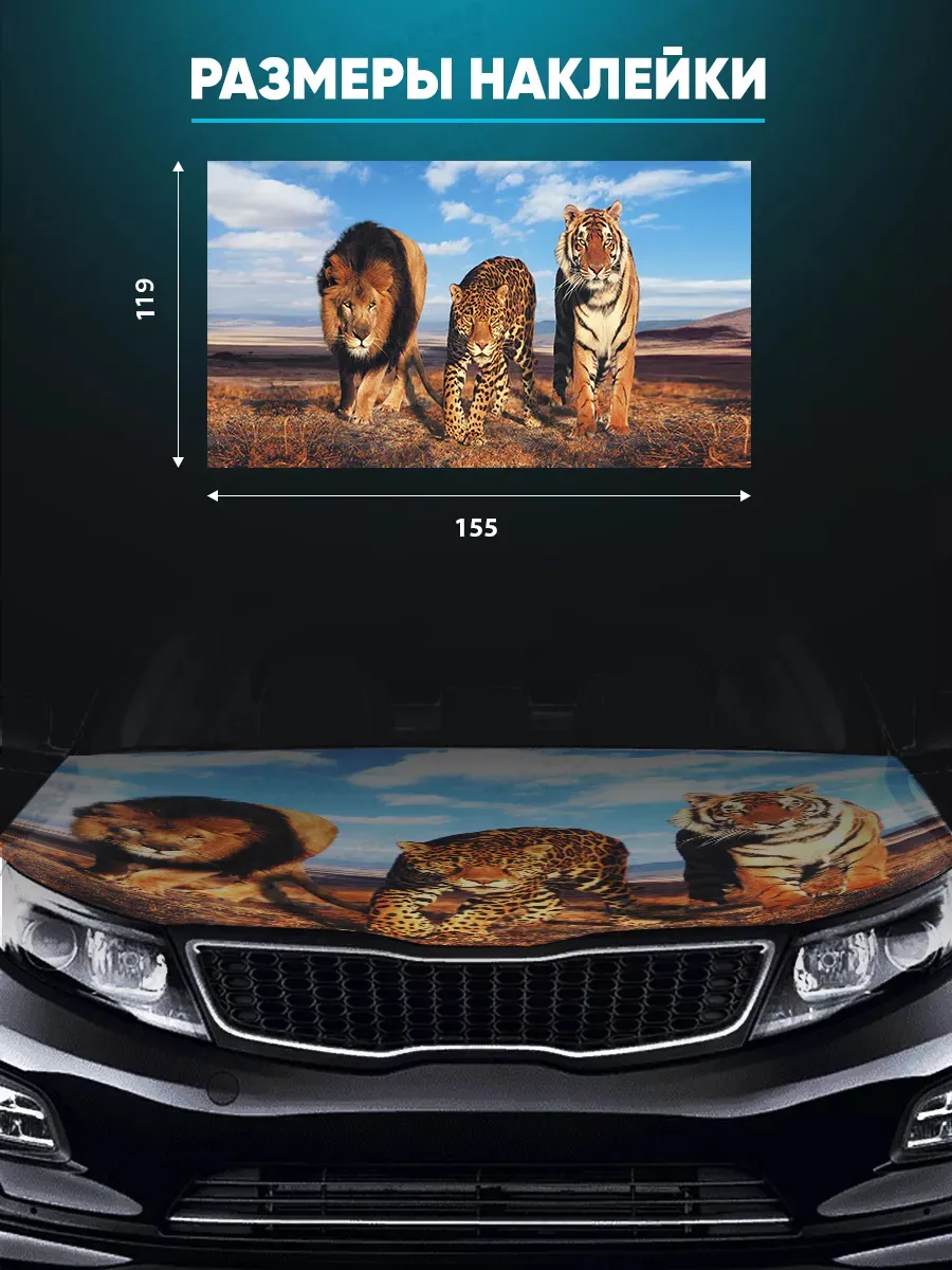 Эта наклейка на капот размером 155х119 см служит декоративным акцентом для автомобиля. Изготовлена на самоклеящейся виниловой пленке ПВХ и защищена ламинацией, поэтому устойчива к влаге, пыли и солнечному свету. При необходимости можно подрезать лист под нужный размер. Легко снимается, не оставляя следов.