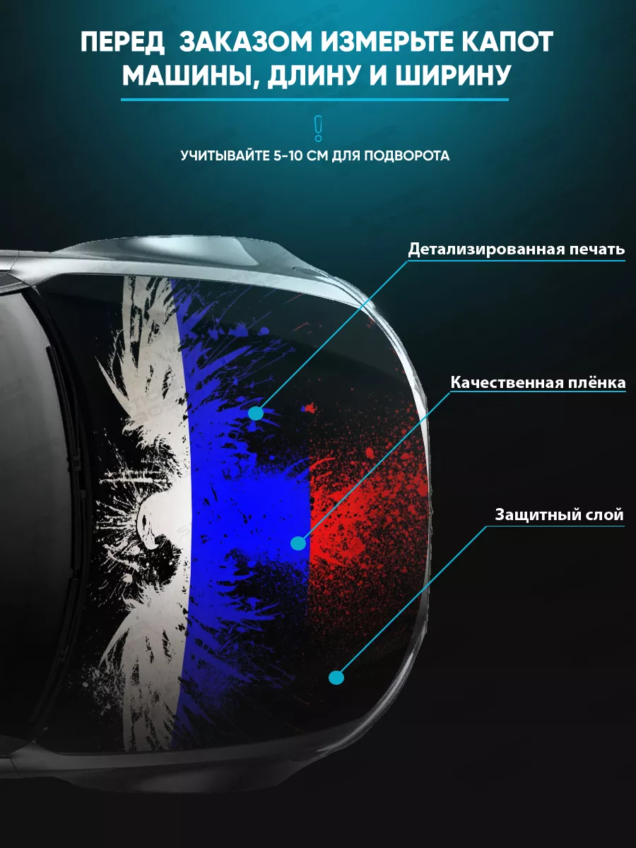Подойдёт для капотов седанов, хэтчбеков и универсалов. При необходимости можно подрезать лист под нужный размер. Наклейка позволяет украсить автомобиль и подчеркнуть стиль.