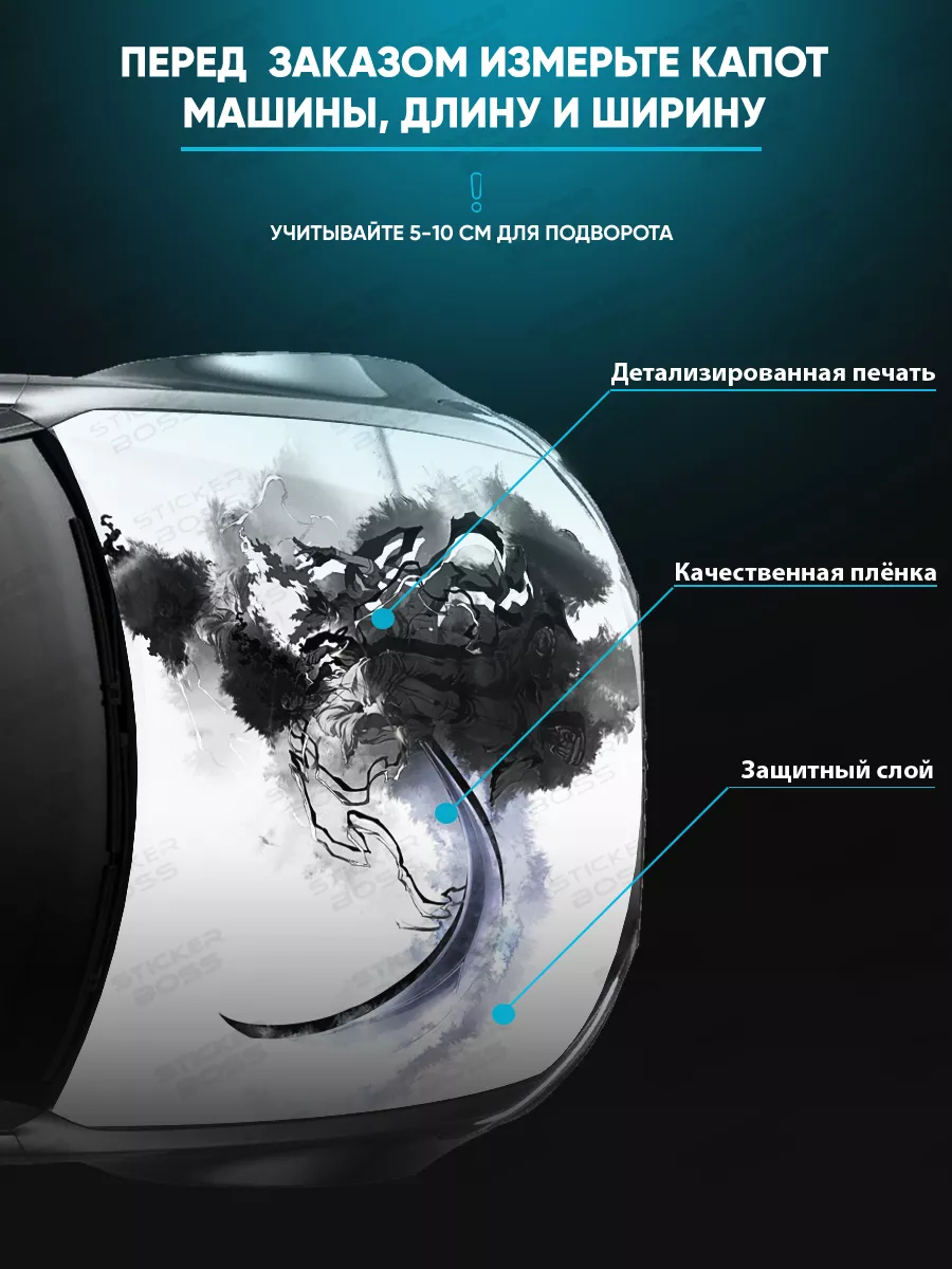 Наклейку можно применить на капот любого автомобиля для придания индивидуального стиля. Широкий ассортимент вариаций позволяет подобрать принт под ваш вкус — от тематических изображений до патриотических мотивов.