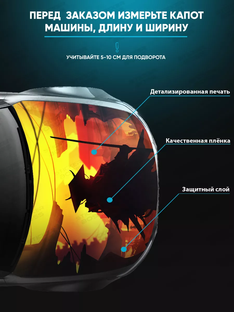 Эта наклейка на капот крупного формата позволяет быстро преобразить внешний вид автомобиля без длительного ремонта и дорогостоящего тюнинга. За счет универсального размера 155х119 см стикер подходит для большинства капотов и дарит автомобилю стильный и запоминающийся облик.