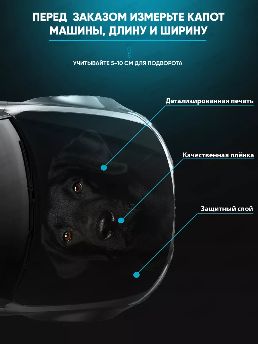Эта большая наклейка на капот подойдёт для большинства современных седанов, хэтчбеков и универсалов. Размер 155х119 см универсальный по поверхности и форме. При желании можно подрезать лист под нужный размер.