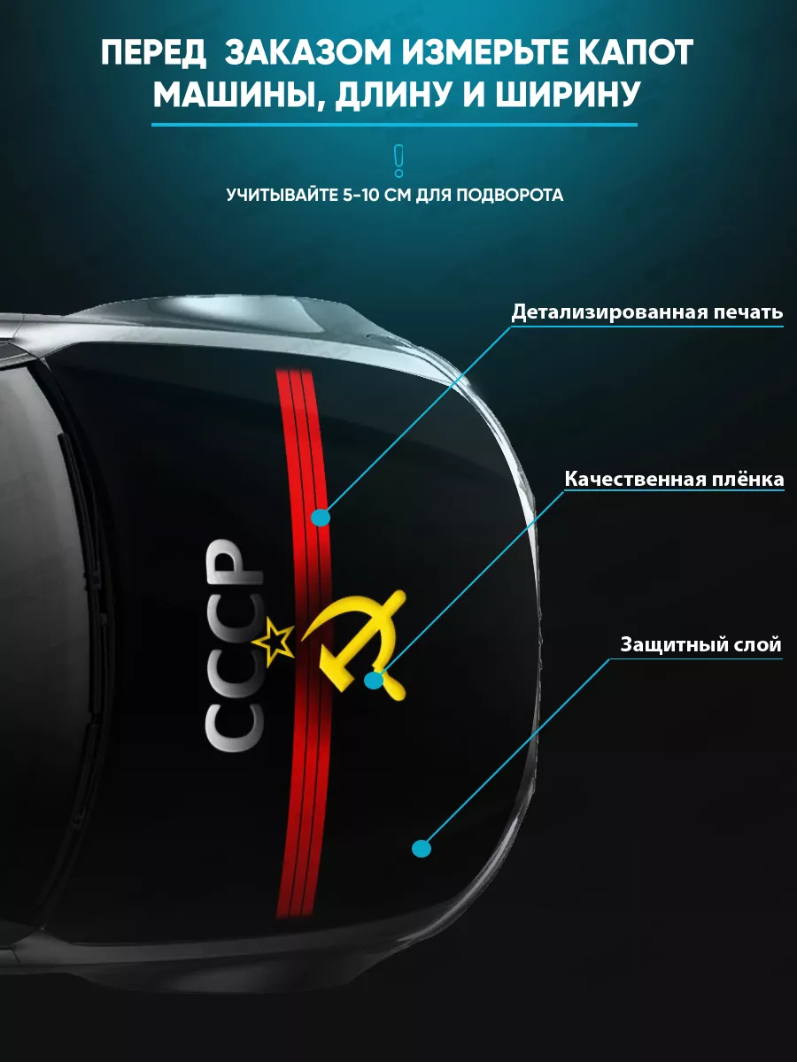 Эта большая декоративная наклейка на капот обеспечивает стиль и индивидуальность вашему автомобилю. Универсальный размер 155x119 см подходит для седанов, хэтчбеков и универсалов. Выполнена на высококачественной самоклеящейся виниловой пленке ПВХ и защищена верхним слоем ламинации, что обеспечивает прочное крепление и защиту от влаги и солнечного выгорания.