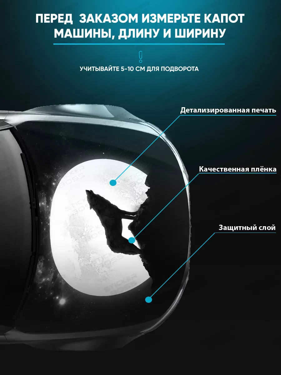 Наклейка на капот авто 155х119 см обеспечивает стиль и индивидуальность вашего автомобиля. Выполнена на высококачественной самоклеящейся виниловой пленке ПВХ с ламинацией, устойчивой к мытью, влаге и солнечному свету. При желании легко снимается, не оставляя следов.