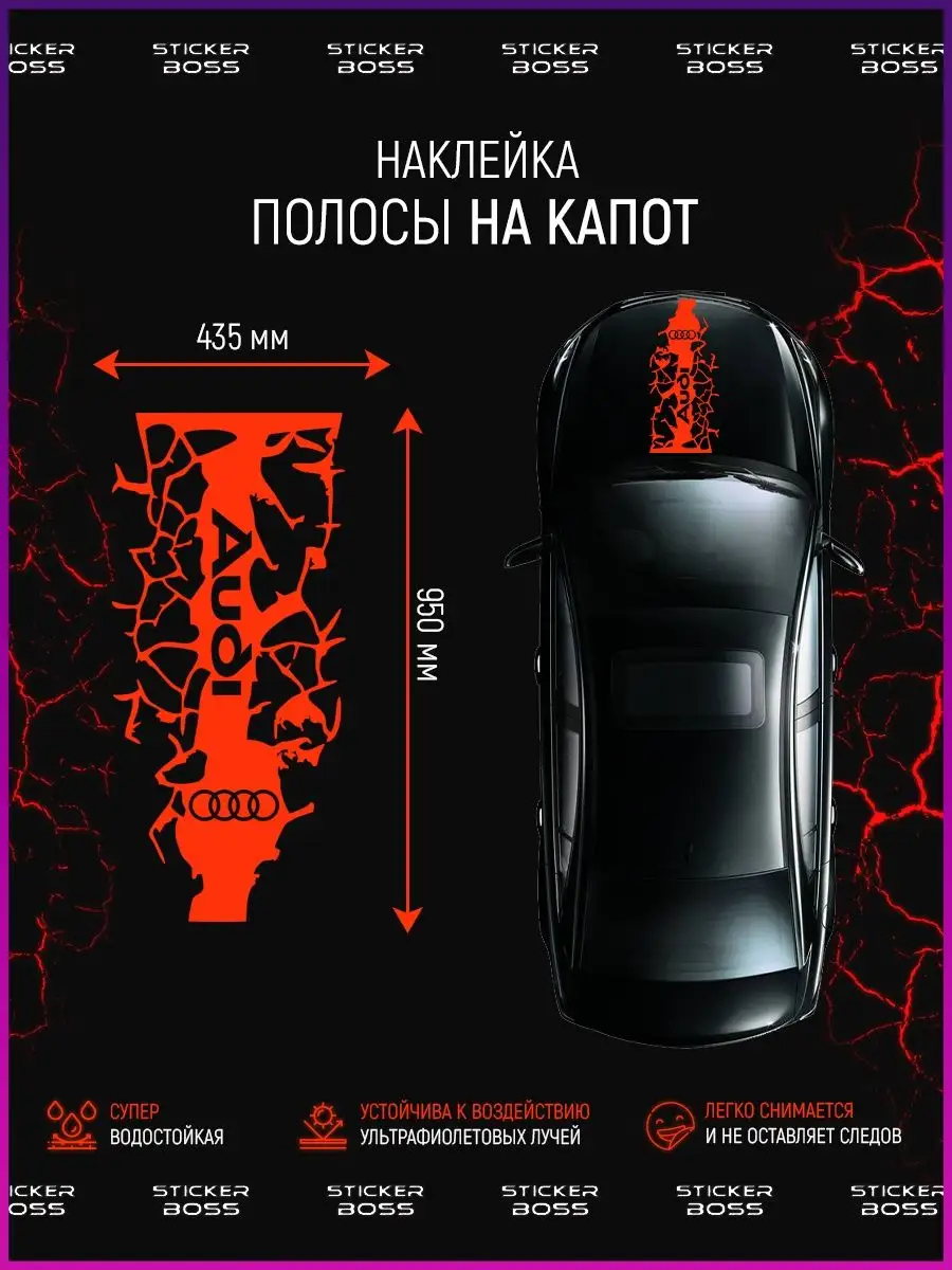 Стикеры Stickerboss — эффективный способ подчеркнуть индивидуальность вашего автомобиля. Наклейка на капот с эффектом трещин визуально динамична и привлекает взгляд, превращая автомобиль в стильное произведение на колесах. Эта модель рассчитана на центр капота и выполнена из прочного материала, выдерживает погодные условия и ультрафиолет, обеспечивая долговечный вид.