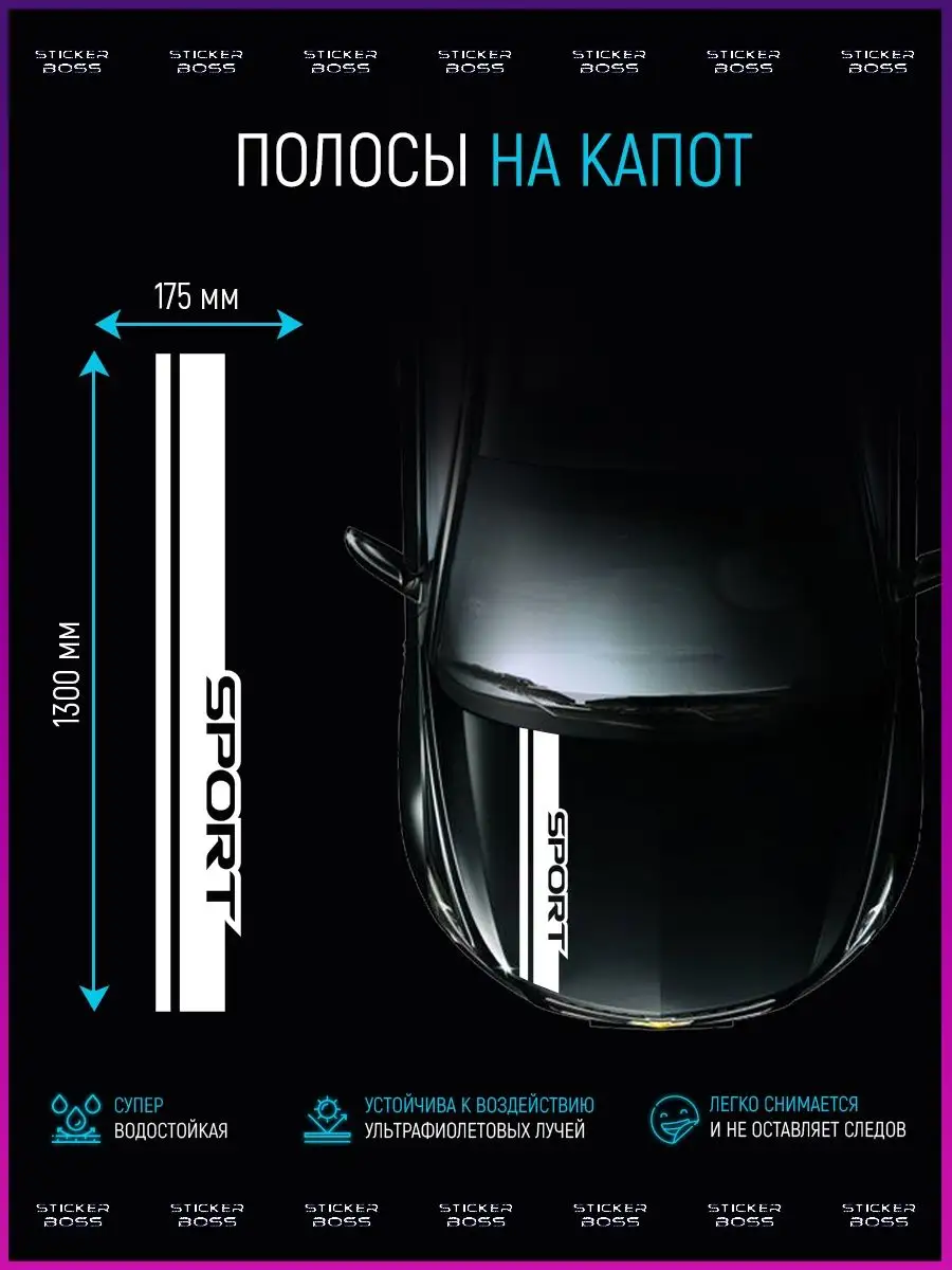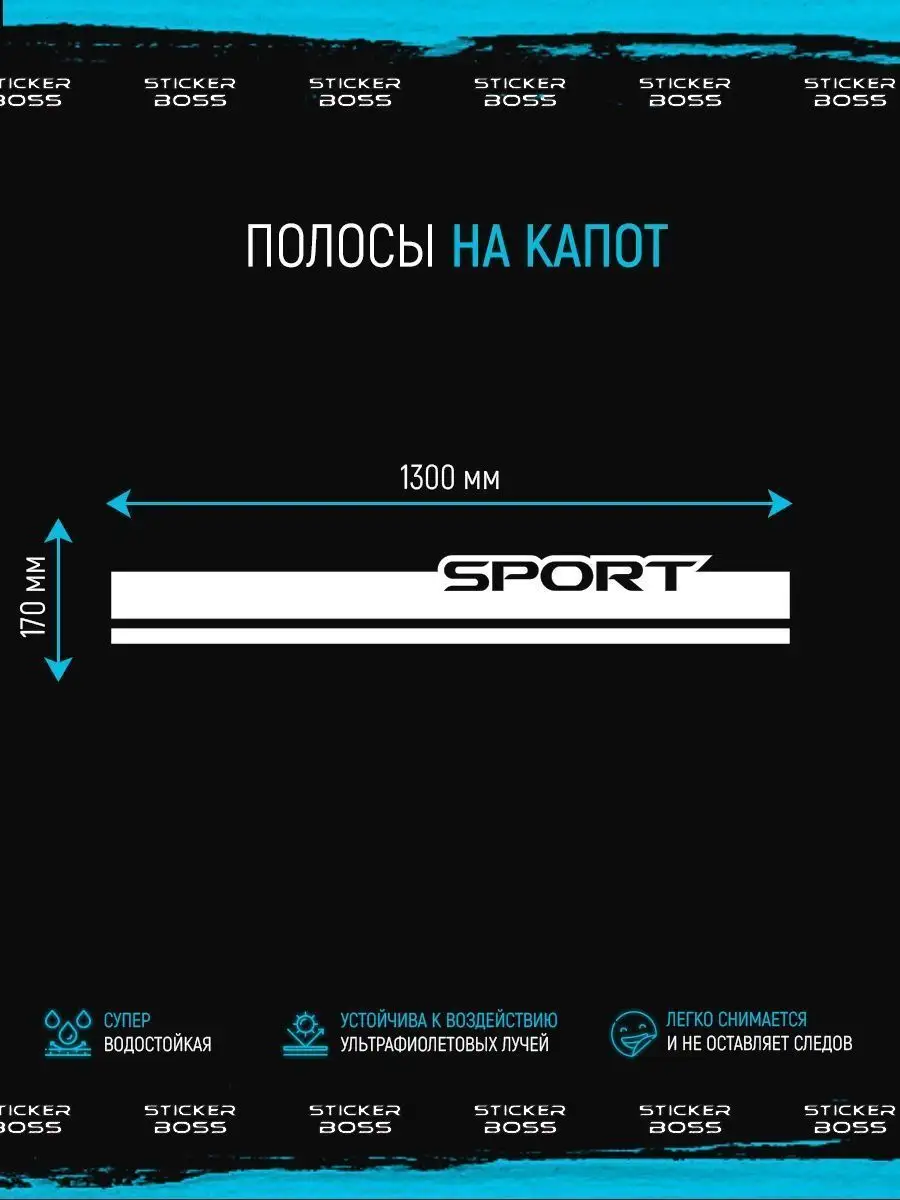 Эта наклейка предназначена для тюнинга и подчёркивания индивидуальности автомобиля. Две аккуратные полосы разной ширины создают динамичный акцент на капоте, а надпись sport усиливает ощущение скорости. Белый цвет наклейки хорошо сочетается с любым цветом кузова, а прочная виниловая пленка ПВХ Oracal обеспечивает долговечность и сохранность цвета в любых условиях.
