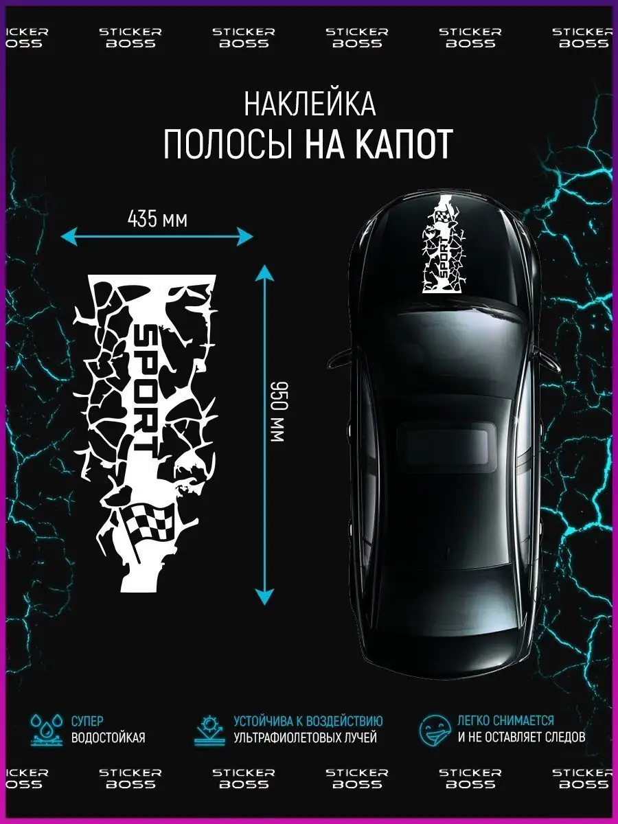 Подходит для оформления капота автомобиля. Динамичный дизайн с двумя полосами и надписью sport придаёт автомобилю индивидуальность и стиль.