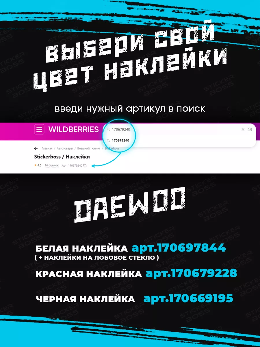 Наклейка Stickerboss для капота с эффектом трещин предназначена для тюнинга и декора автомобиля. Дизайн размещается по центру капота и может включать надпись с названием марки, подчеркивая идентичность и стиль Daewoo.
