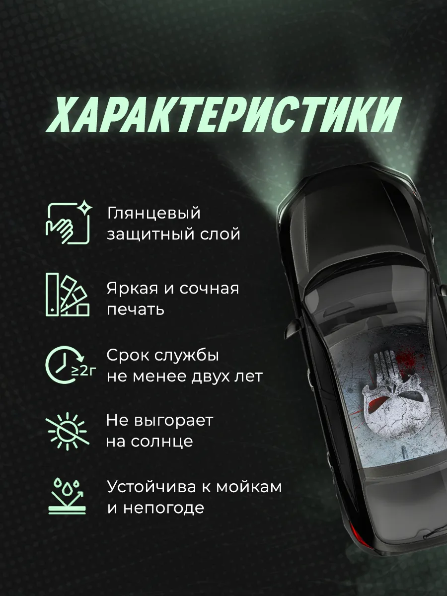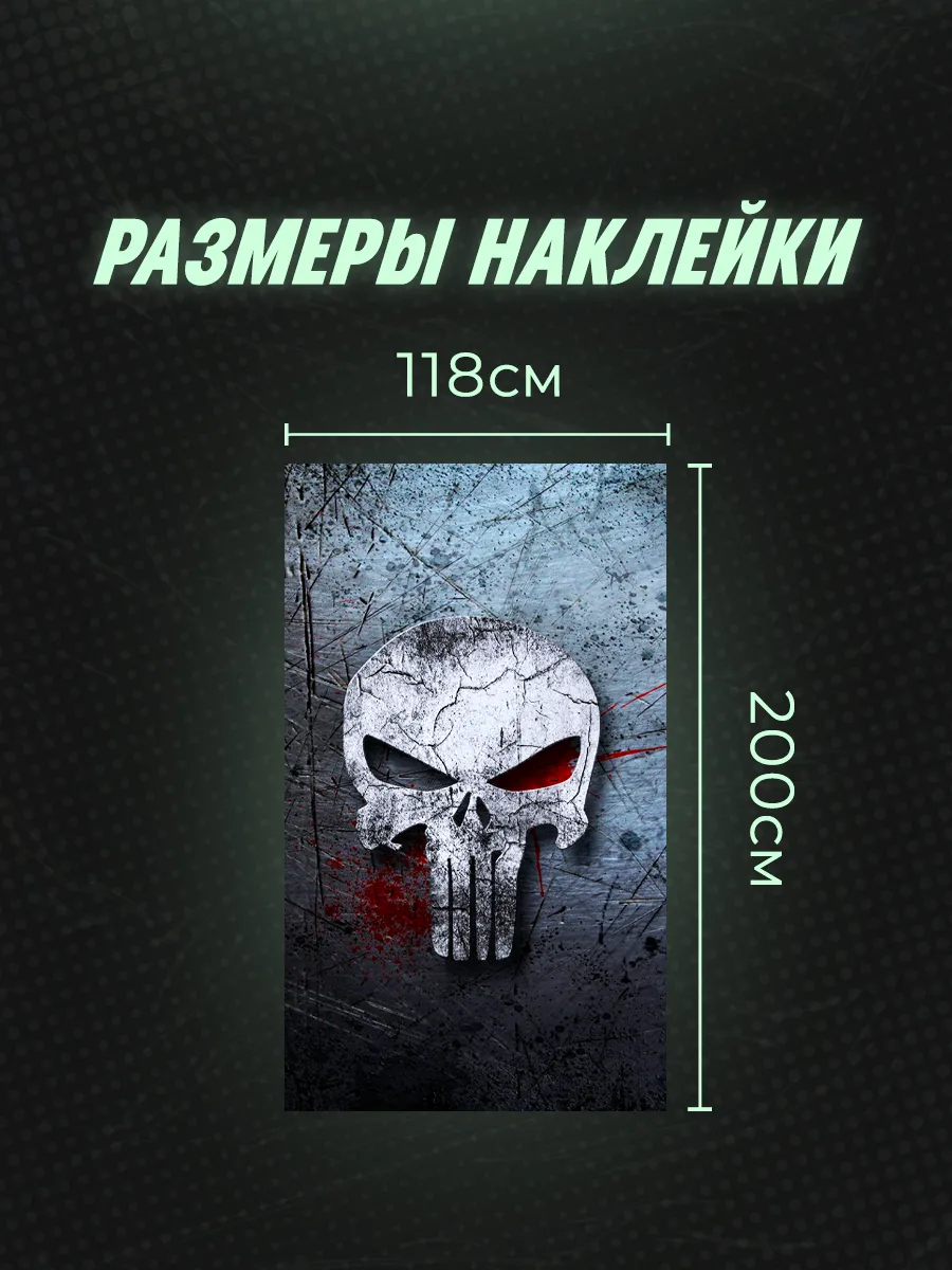 Эта наклейка на крышу автомобиля размером 200х118 см позволяет преобразить внешний вид машины и придать ей выразительный стиль. Изготовлена из долговечной самоклеющейся виниловой плёнки ПВХ, устойчивой к выгоранию и царапинам. Дизайн выполнен в образе Карателя черепа, что делает транспорт выделяющимся на дороге и подчеркивает индивидуальность владельца.