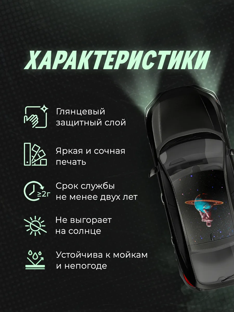 Наклейка на крышу авто размером 200х118 см позволяет превратить обычное транспортное средство в объект восхищения. Это декоративный элемент, который подчеркивает индивидуальность и помогает выделиться на дороге. В коллекции представлены различные принты, от ярких флагов до сцен из культовых фильмов и оригинальные узоры.