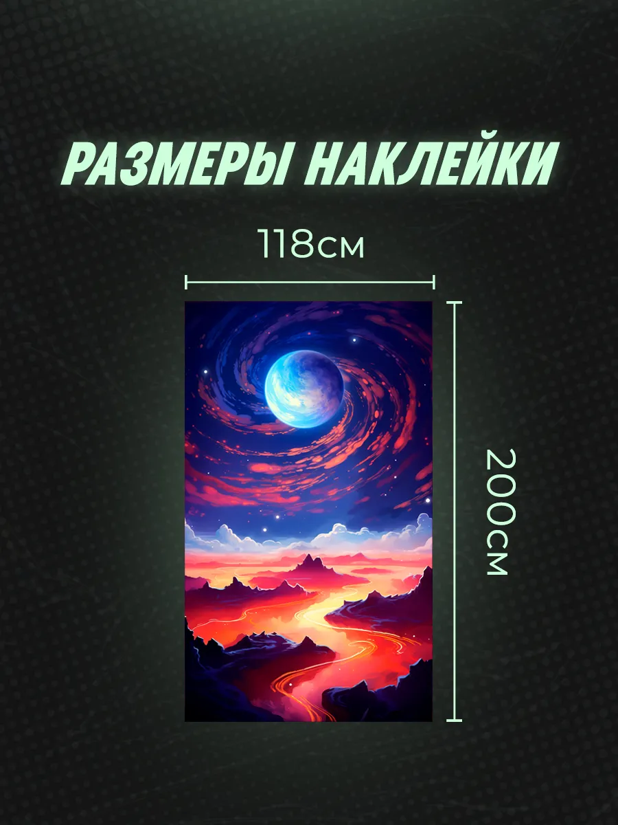 Эта наклейка на крышу авто размером 200х118 см превращает крышу в эффектный элемент дизайна и выделяет автомобиль на дороге. Дизайн сочетает космические мотивы и горы, что подойдёт для любителей оригинального стиля. Наклейка изготовлена на самоклеющейся виниловой пленке ПВХ, устойчива к выгоранию и сохраняет яркость цветов. Установка проста и может выполнить любой автолюбитель. Превратите крышу вашего автомобиля в произведение искусства.