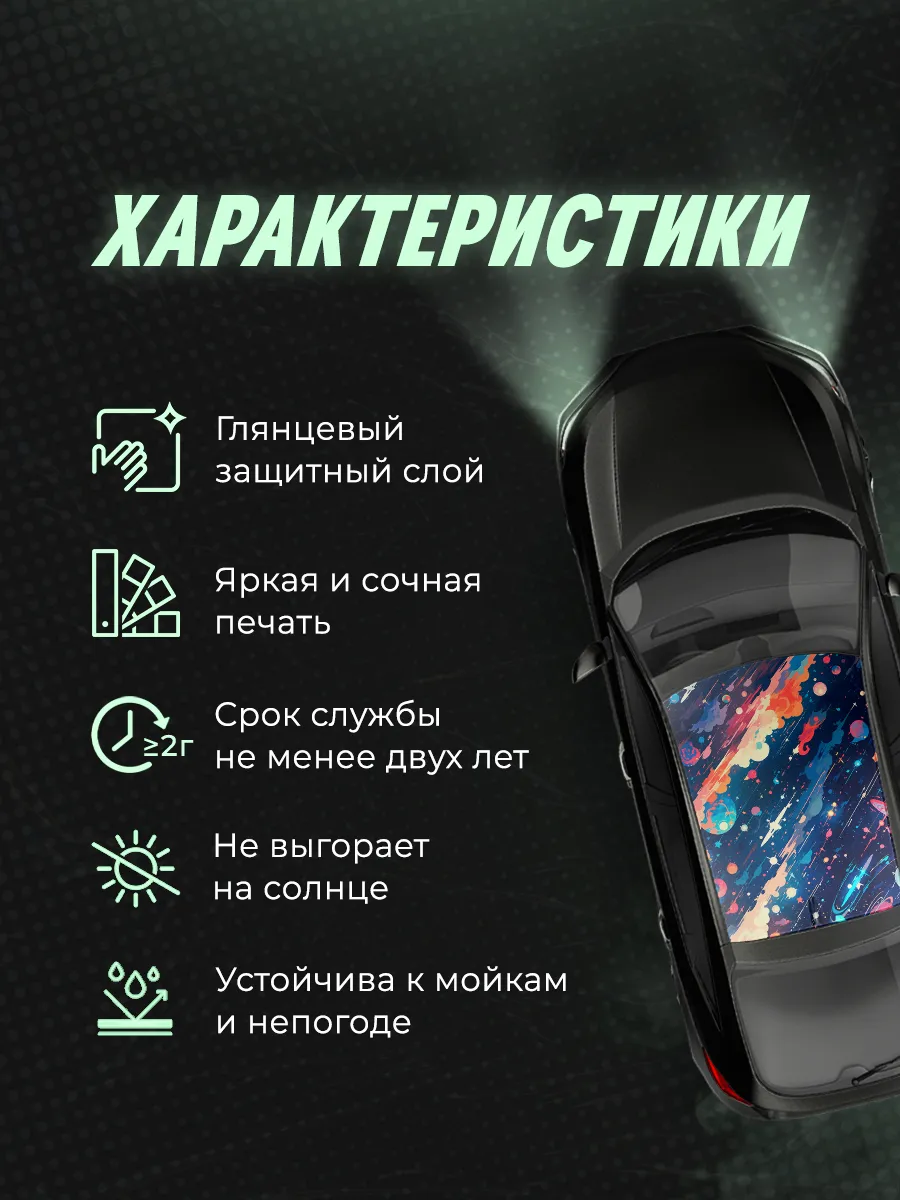 Эта наклейка позволяет преобразить крышу автомобиля в заметный элемент дизайна, не забывая о долговечности и практичности. Рисунок космоса выполнен на качественной виниловой пленке ПВХ, что обеспечивает стойкость к выгоранию и яркость цветов при любых условиях эксплуатации. Наклейка проста в установке и подходит для стандартных крыш автомобилей.