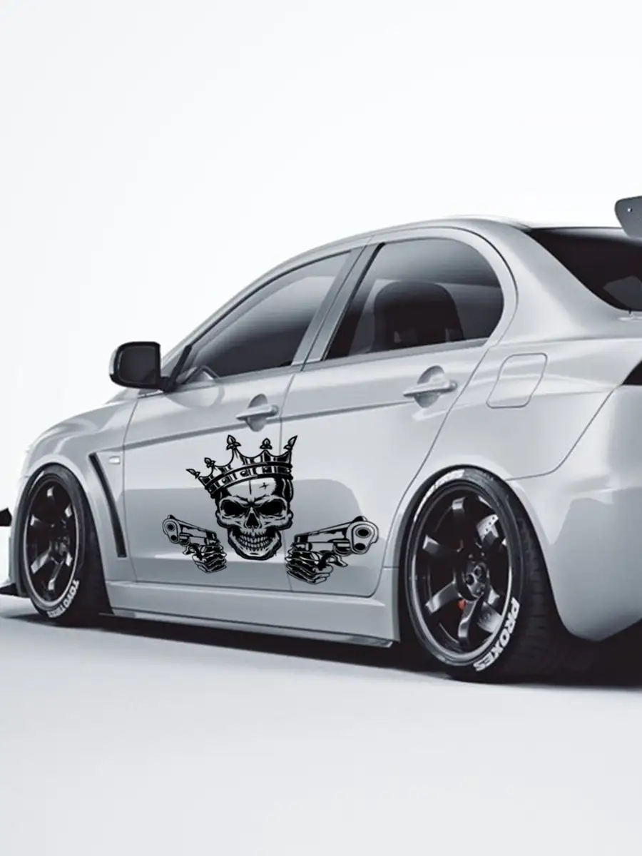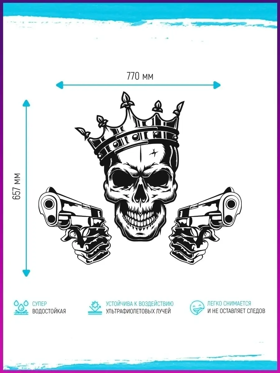 Эта наклейка на стекло автомобиля выполнена из виниловой пленки ПВХ Oracal и представляет стильный элемент тюнинга. Черный рисунок черепа с пистолетами подчёркивает индивидуальность и подходит для внешнего использования на автомобилях.