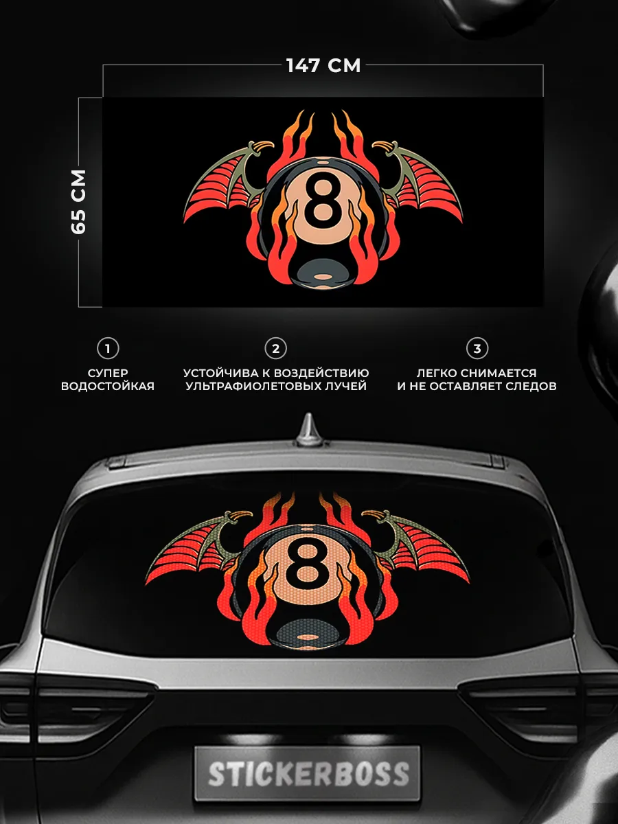 Декоративная наклейка на заднее стекло автомобиля размером 150x70 см подходит для большинства седанов, хэтчбеков и универсалов. Перфорированная виниловая пленка ПВХ обеспечивает прочное крепление и сохраняет внешний вид в любых погодных условиях.