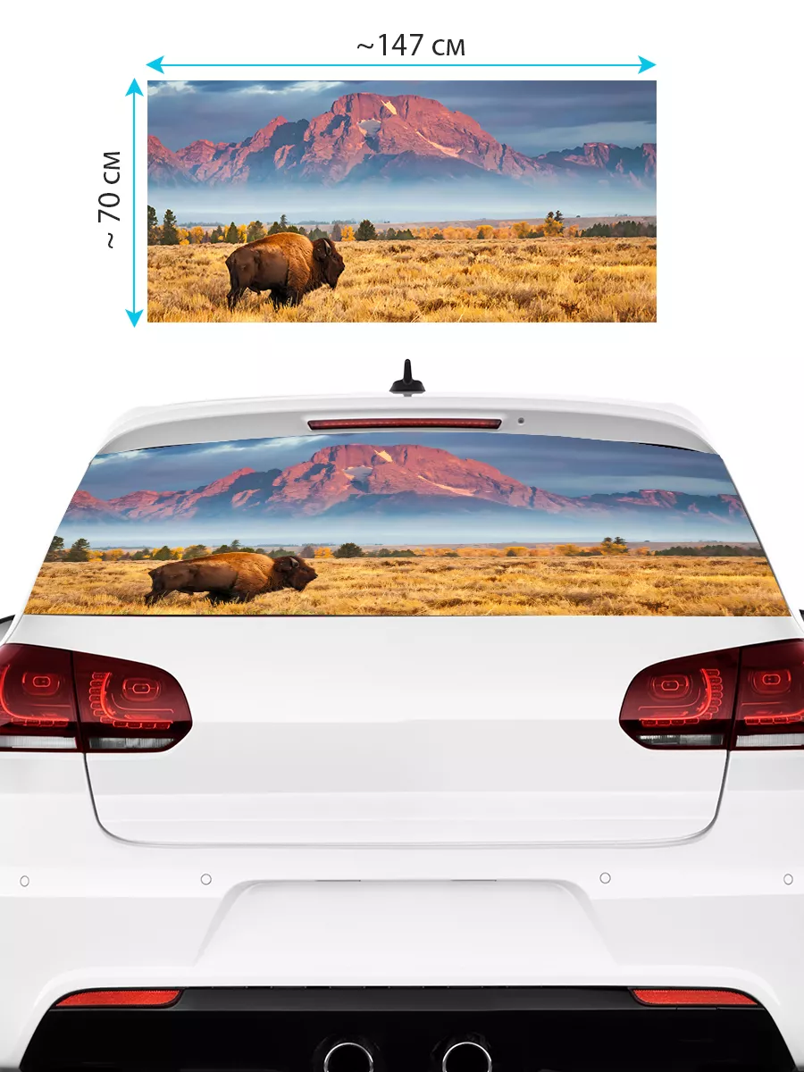 Стильная наклейка на заднее стекло автомобиля с изображением горного пейзажа позволяет придать машине выразительный облик и одновременно сохранить приватность за счёт тонировки без использования стекла.