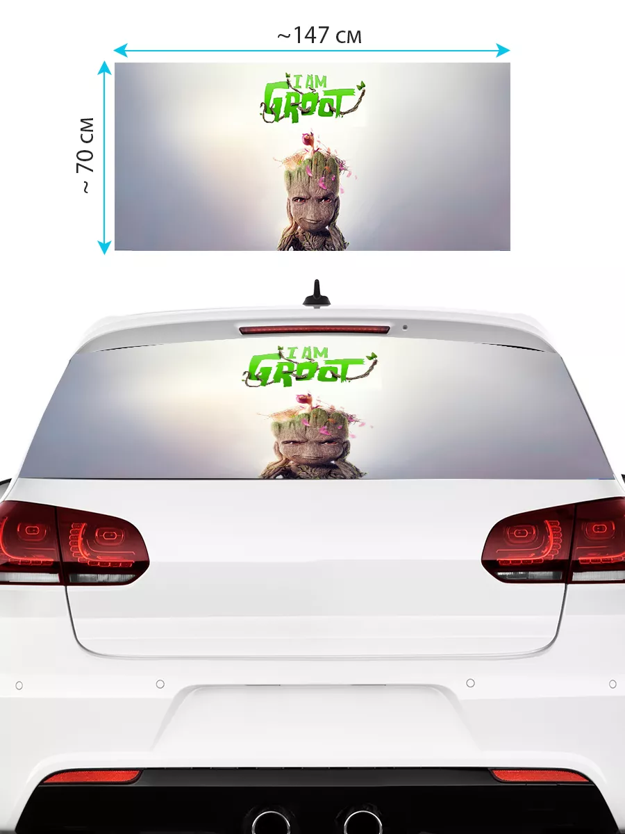 Декоративная наклейка на заднее стекло автомобиля с принтом Грут изготовлена из перфорированной самоклеящейся виниловой пленки ПВХ. Размер 150х70 см универсален и подходит для большинства кузовов, включая седаны, хэтчбеки и универсалы. По желанию можно подрезать лист под нужный размер.