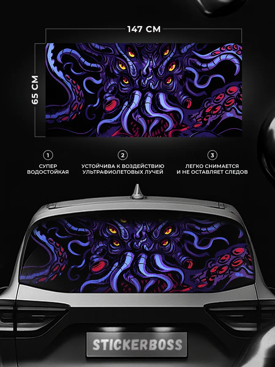 Большая декоративная наклейка на заднее стекло автомобиля размером 150×70 см. Перфорированная самоклеящаяся виниловая пленка ПВХ обеспечивает прочное крепление к поверхности и устойчивость к мытью, пыли, влаге и солнечному свету. При необходимости можно подрезать лист под нужный размер. Наклейка легко снимается без следов.