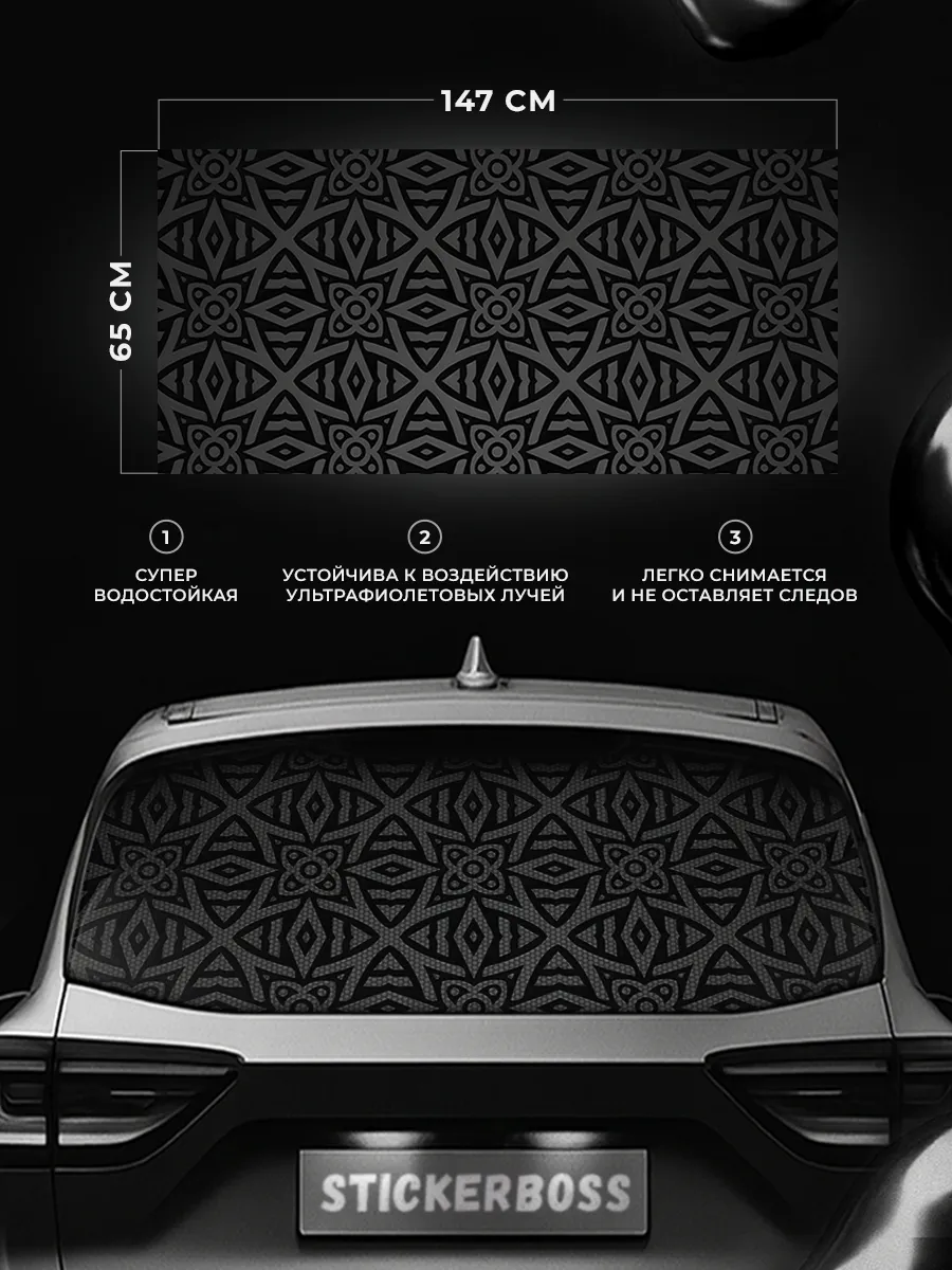 Преимущество данной наклейки — декоративность и универсальность. Наклейка фиксируется на заднее стекло и визуально преображает интерьер автомобиля, сохраняя при этом обзорность по периметру благодаря перфорации.