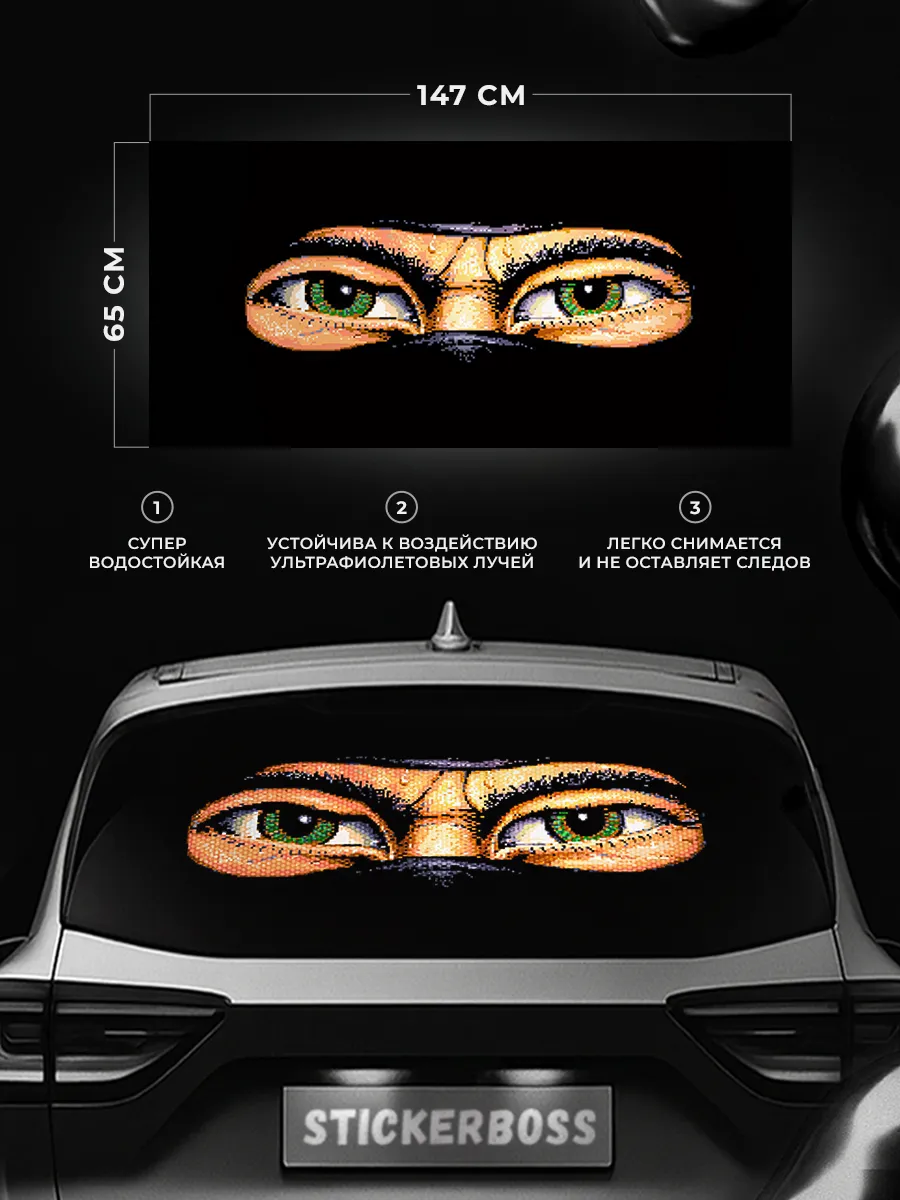 Большая декоративная наклейка на заднее стекло автомобиля размером 150x70 см позволяет придать автомобилю индивидуальность и стиль. Наклейка изготовлена из перфорированной самоклеящейся виниловой пленки ПВХ, что обеспечивает прочное крепление к поверхности, устойчивость к мытью, влаге и солнечному ультрафиолету. При необходимости можно подрезать лист под нужный размер. При демонтаже не оставляет следов.