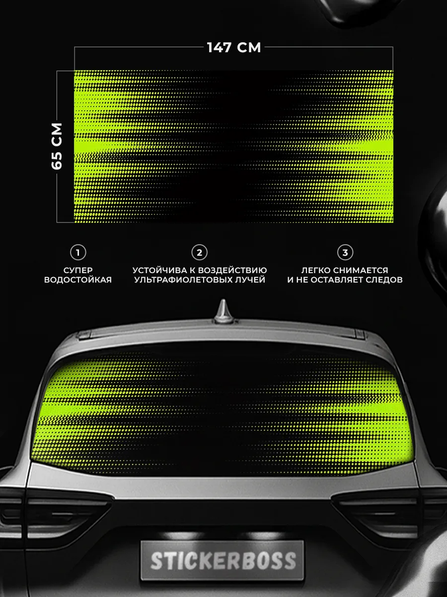 Эта наклейка предназначена для декоративного оформления заднего стекла автомобиля. Размер 150х70 см делает ее универсальной для большинства моделей, включая седаны, хэтчбеки и универсалы. Перфорированная сетка визуально придает автомобилю стиль, сохраняет приватность внутри салона и одновременно не мешает обзору. При необходимости можно подрезать лист под нужный размер.